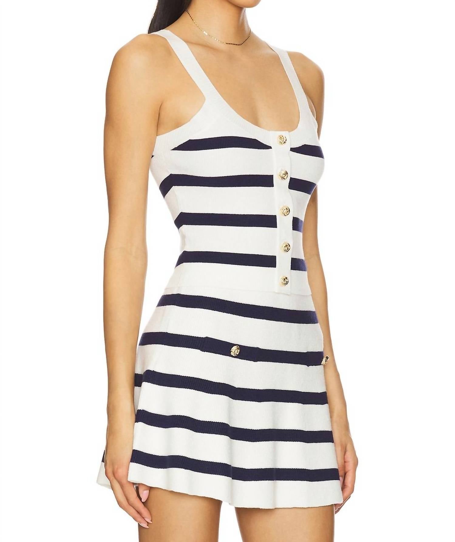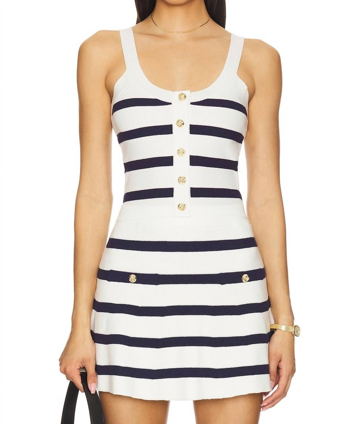 Elevate your summer wardrobe with the Alesso Sweater Tank by Generation Love, featuring a refreshing navy and white stripe pattern. This sleeveless, scoopneck tank is crafted from a luxurious blend of 35% modal, 30% polyester, 20% nylon, and 15% acrylic, with a slim-fit silhouette and a trendy 9.5" garment length. It showcases a modern touch with matte finish knot button detailing and practical button closure. Care instructions recommend hand washing and laying flat to dry for best maintenance.