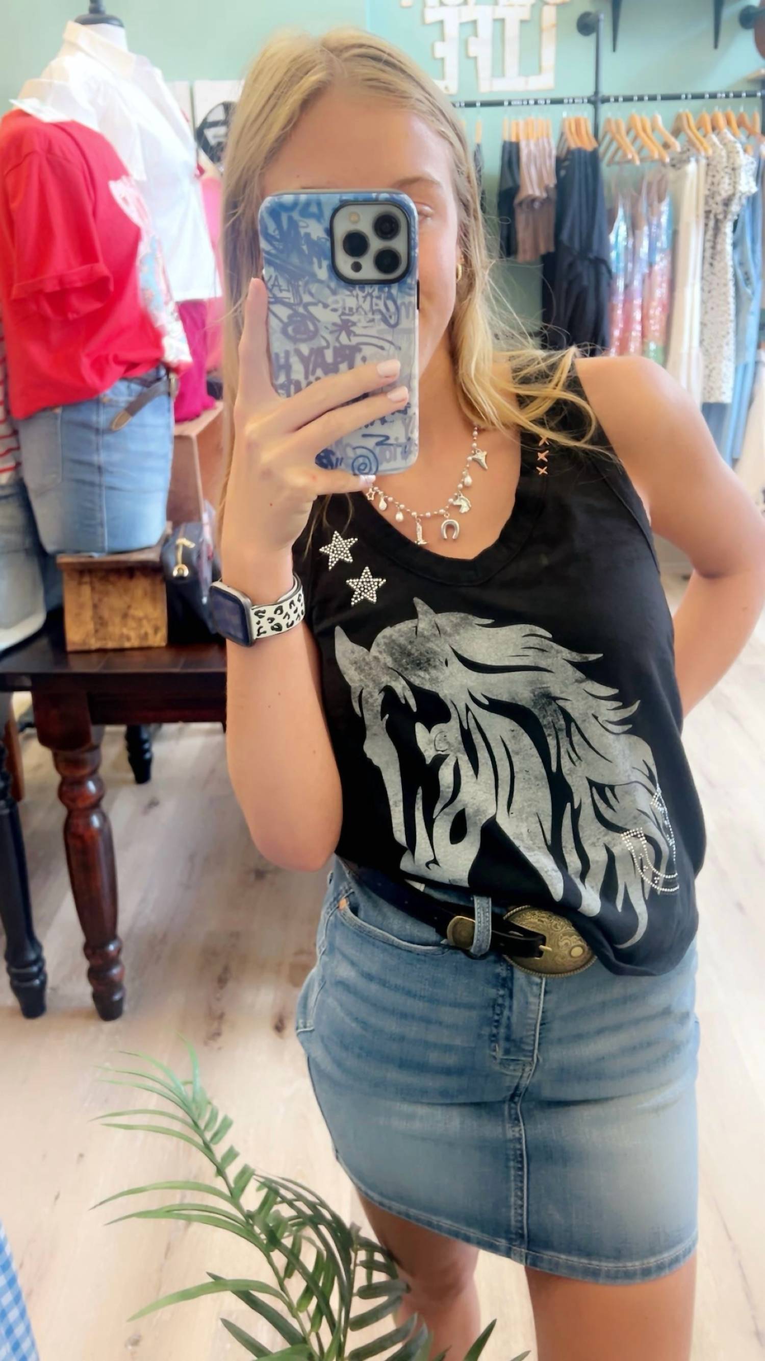 This classic tank top is perfect for layering and cute enough to wear on its own. Introducing the Metal Trim Western Black Graphic Tank Top by All Us, designed for a bold, laid-back look with its sleeveless style. Crafted from soft cotton, this tank sports a unique graphic pattern and a stylish scoop neckline, resembling the spirit of the West. Proudly made in the USA, it offers a pull-on closure for effortless wear. Care for this versatile piece with a machine wash and tumble dry for easy maintenance.