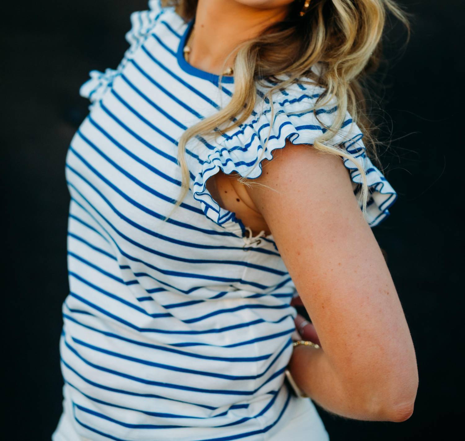 Embrace timeless elegance with the Akiko Stripe Boat Neck Top by Another Love, perfect for versatile summer and vacation wear. This chic top features cap-length ruffle sleeves and a sophisticated boat neck, all adorned in a classic navy and white stripe pattern. Closure: Pull on. Ideal for pairing with jeans or skirts, this piece effortlessly transitions from work to weekend.