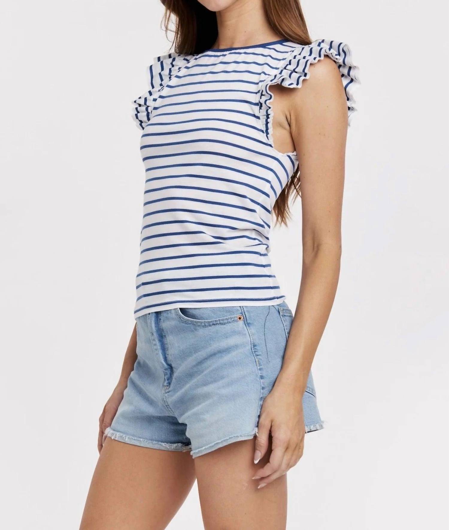A versatile blouse that works from desk to dinner! Embrace timeless elegance with the Akiko Stripe Boat Neck Top by Another Love, perfect for versatile summer and vacation wear. This chic top features cap-length ruffle sleeves and a sophisticated boat neck, all adorned in a classic navy and white stripe pattern. Closure: Pull on. Ideal for pairing with jeans or skirts, this piece effortlessly transitions from work to weekend.