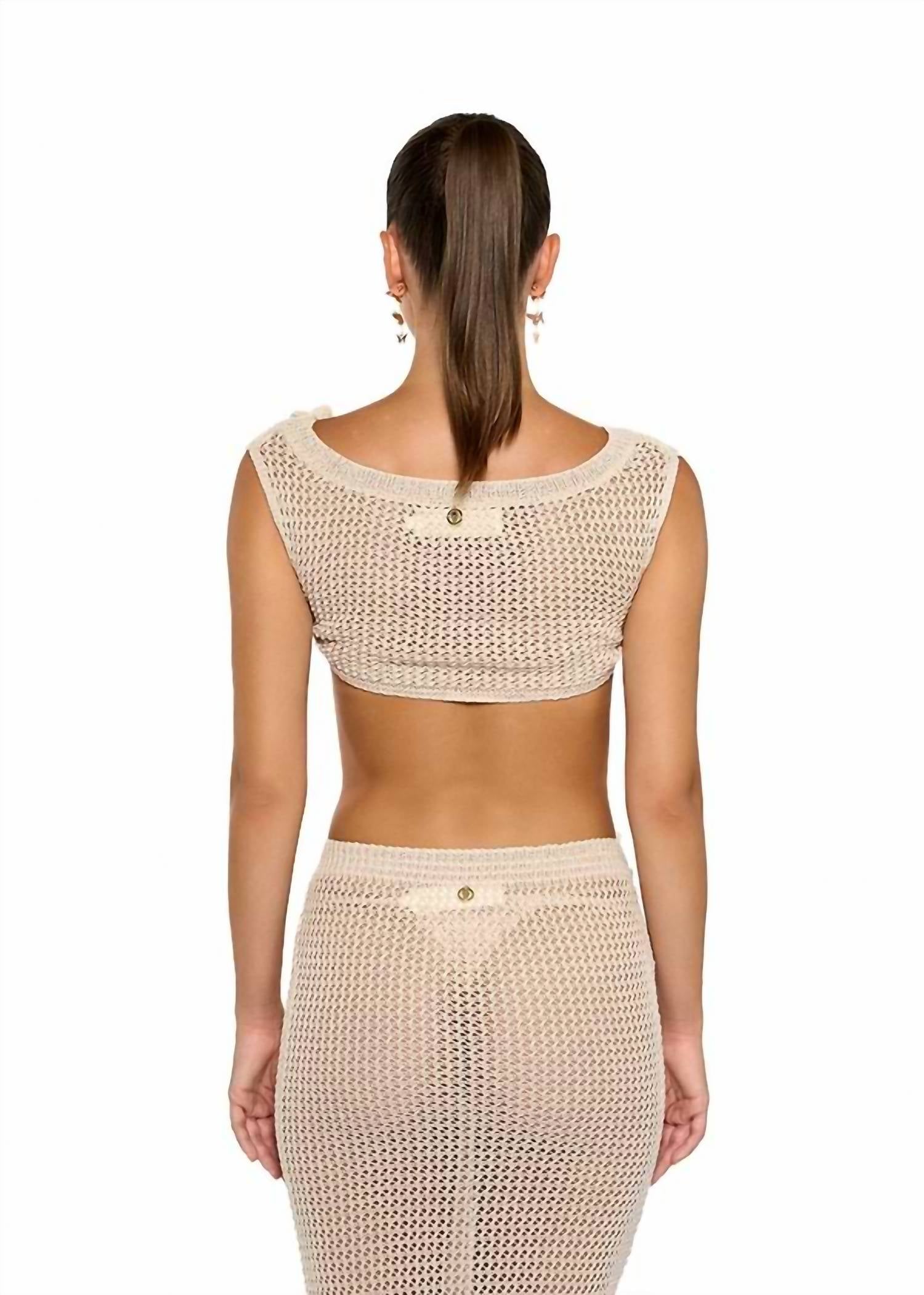 Show a little skin in this cute and casual crop top. Experience effortless style with the Yoko Knitted Crop Top by Bananhot, perfect for your vacation wardrobe. This sleeveless top features a charming boat neckline with intricate floral appliqués on the shoulder, adding elegance to its minimalist design in a textured sand hue. Made from a blend of 83% poly and 17% elastane with a pull-on closure, it ensures comfort and a sleek fit. Care is simple with hand wash instructions for easy maintenance.