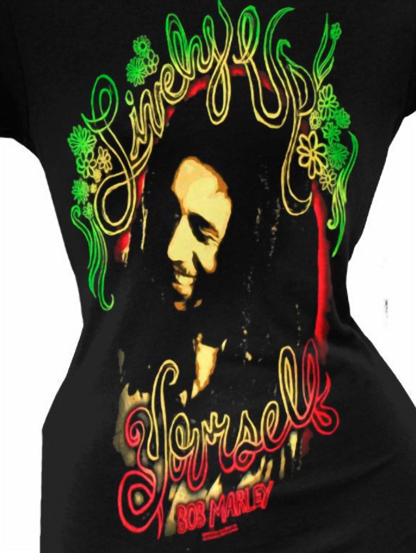 Celebrate legendary style with the Women's Yourself Juniors T-shirt by Bob Marley, featuring a vibrant graphic print on a classic black cotton tee. This short sleeve, pull-on piece is perfect for summer streetwear and holiday parties, capturing the essence of legendary music with ease. The juniors fitted design offers a flattering fit while the crewneck provides timeless comfort. Although specific care instructions aren't provided, treating cotton garments with gentle care will help maintain their iconic style.