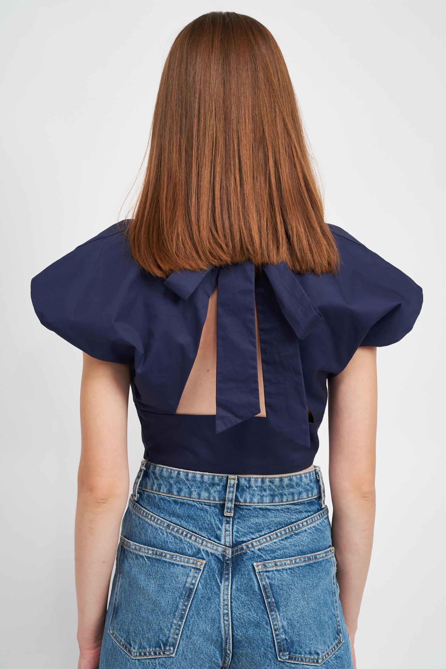 The Avery Poplin Top by En Saison is a chic addition to your spring and summer wardrobe, designed in a stylish navy solid color. Featuring a flattering V-neck and cap sleeves, it adds a touch of minimalistic elegance suitable for a dinner party. Made from 100% cotton, it promises comfort and breathability. This crop top includes a unique tie-back bow detail and uses a tie closure for a feminine touch. For care, hand wash only. Model is 5'9" wearing a size small.