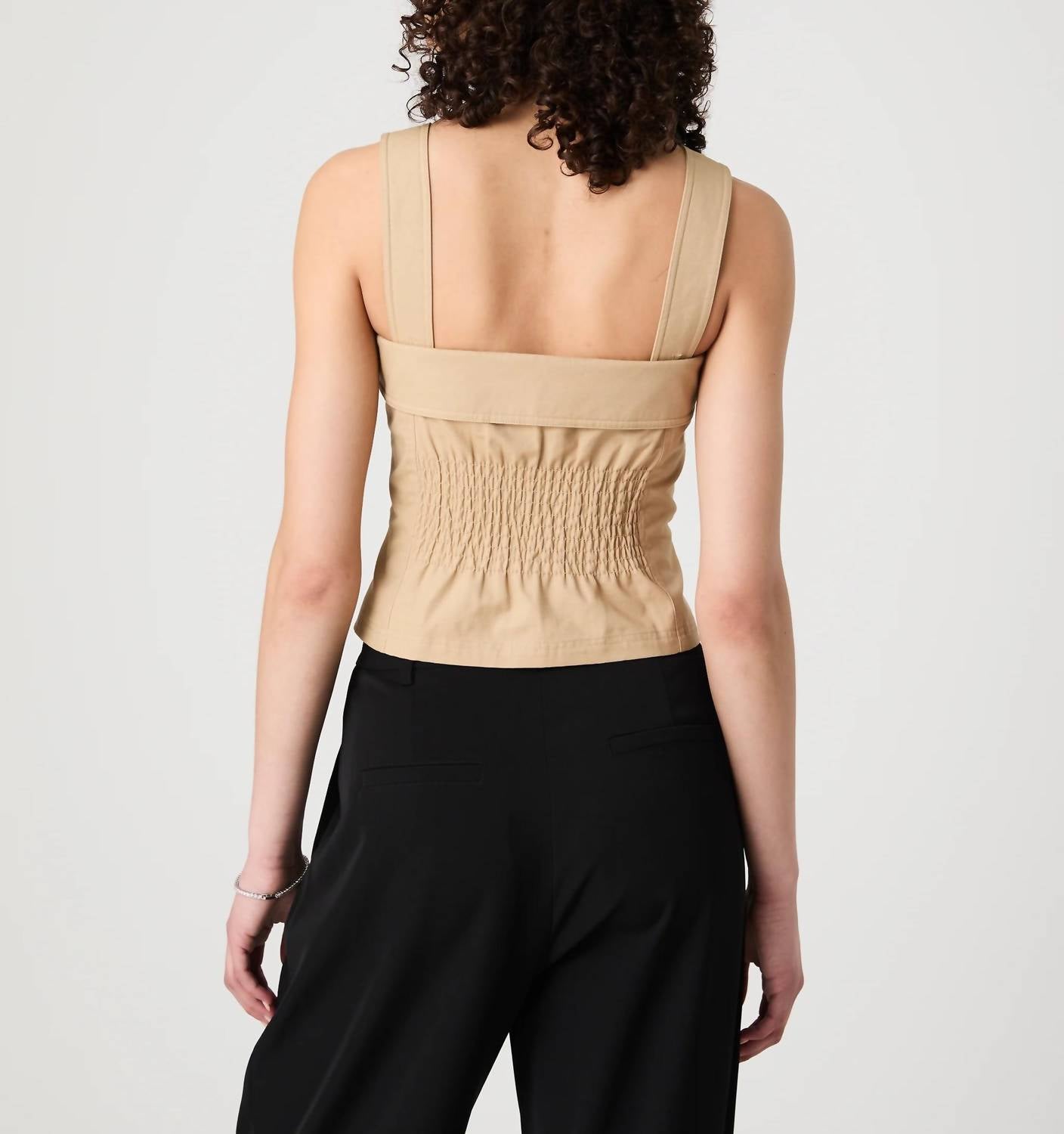 Fit, fabric and functionality. This tank top checks all the boxes. Step into effortless style with the Trench Squareneck Top by French Connection, a modern piece for the minimalist wardrobe. This tank features a sleeveless design crafted from 100% cotton, ensuring comfort in warm weather. The double-breasted button closure and smocked back panel offer a structured yet relaxed fit, complemented by adjustable thick straps and a chic square neckline. Care instructions include machine wash and line dry. Perfect for an engagement or Easter celebration, this beige, solid pattern top is a versatile addition to any summer collection.