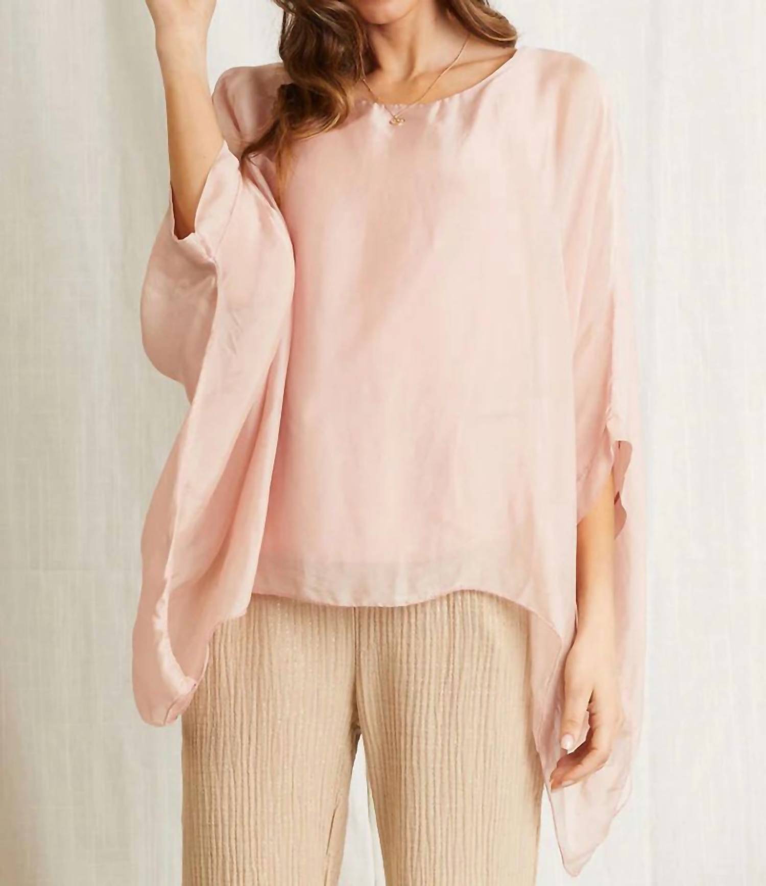 Pair this with your favorite jeans and slides for your next girls night out. Elevate your wardrobe with the Amber Italian Silk Top by Scandal Italy, a luxurious piece in elegant pink ideal for any occasion. Crafted from 100% Italian silk with an airy flowy silhouette, this blouse features short sleeves and a feminine scoop neckline for a sophisticated touch. Composition: 100% Silk; Lining: 95% Viscose, 5% Spandex. Closure: Pull-on. Care: Dry clean only, Made in Italy.