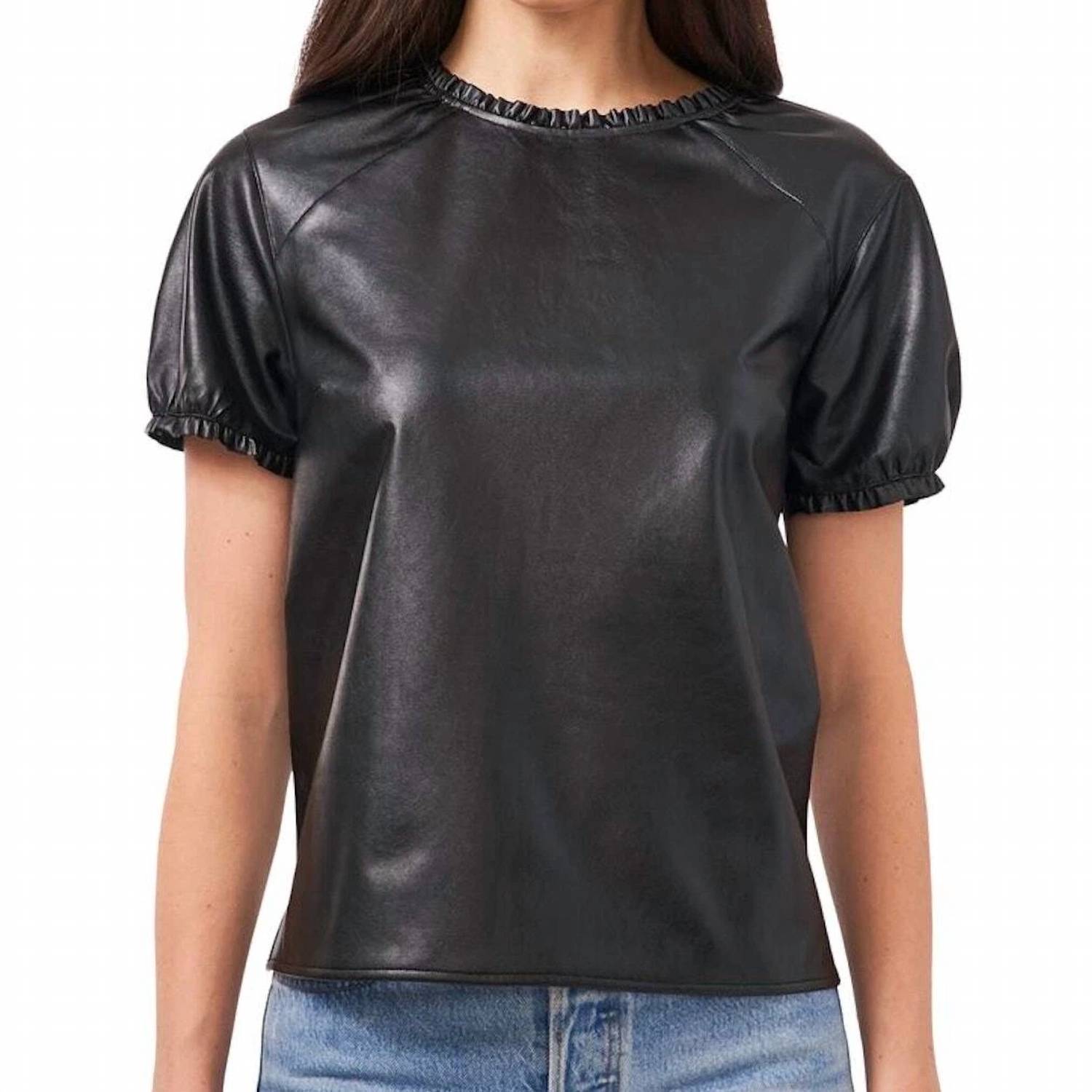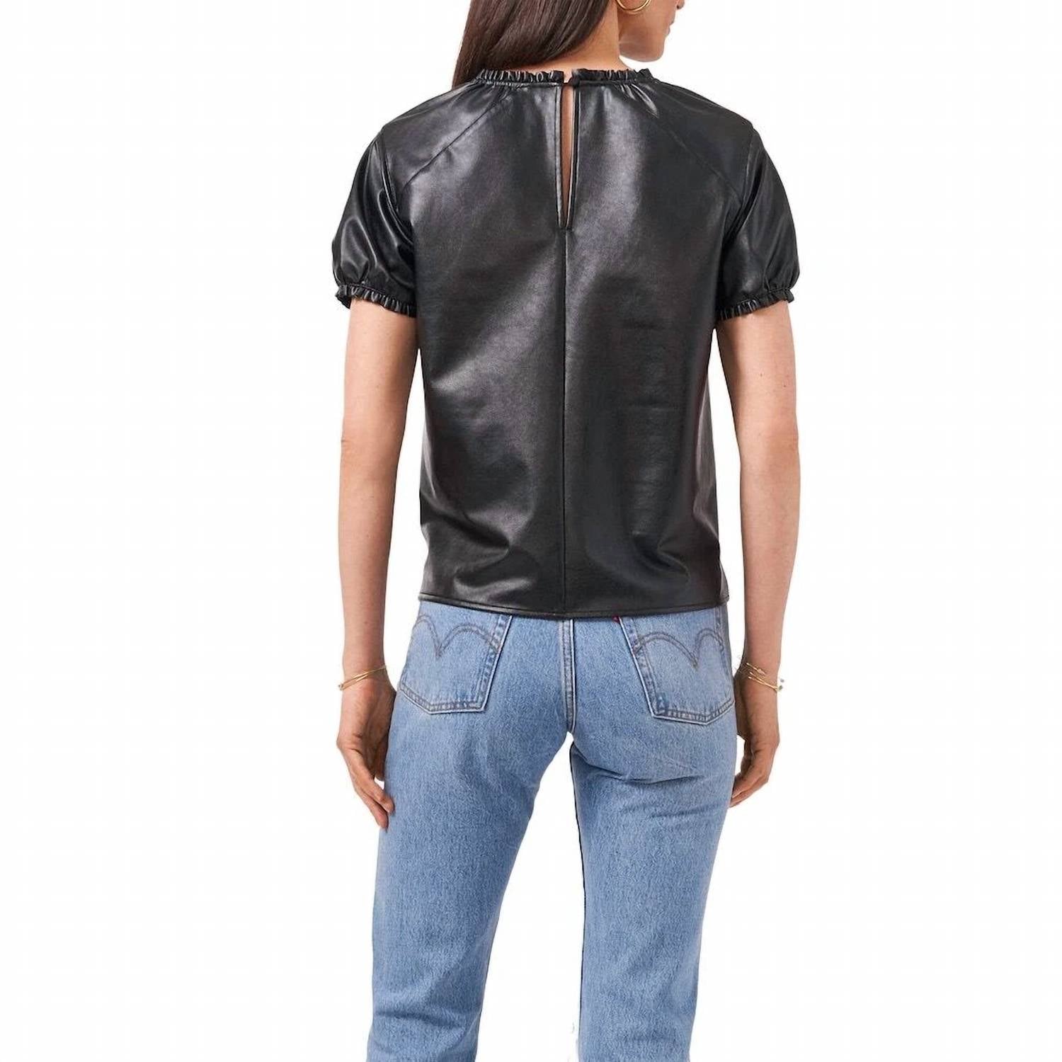 A timeless blouse that will never go out of style. Elevate your wardrobe with the Ruffle Trim Faux Leather Shirt by 1.STATE, a rich black blouse that effortlessly combines edgy style with a touch of romance. Designed with a crewneck and short puff sleeves, this top features a chic ruffle trim and is made from 100% polyurethane. The garment measures 23 1/2" in length and includes a back keyhole with button-and-loop closure. Ideal for a preppy trend, it comes lined and promises a sleek, solid pattern perfect for any occasion.