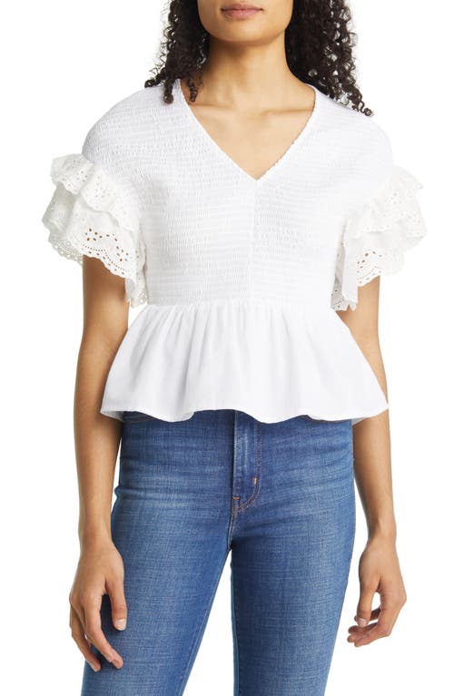 Simple yet chic 1.STATE flutter smocked top.| Pull on| Short sleeve| V-neck| This item purchased online must be returned to the vendor by mail only. This item cannot be returned to stores.| 100% Cotton| Machine Washable