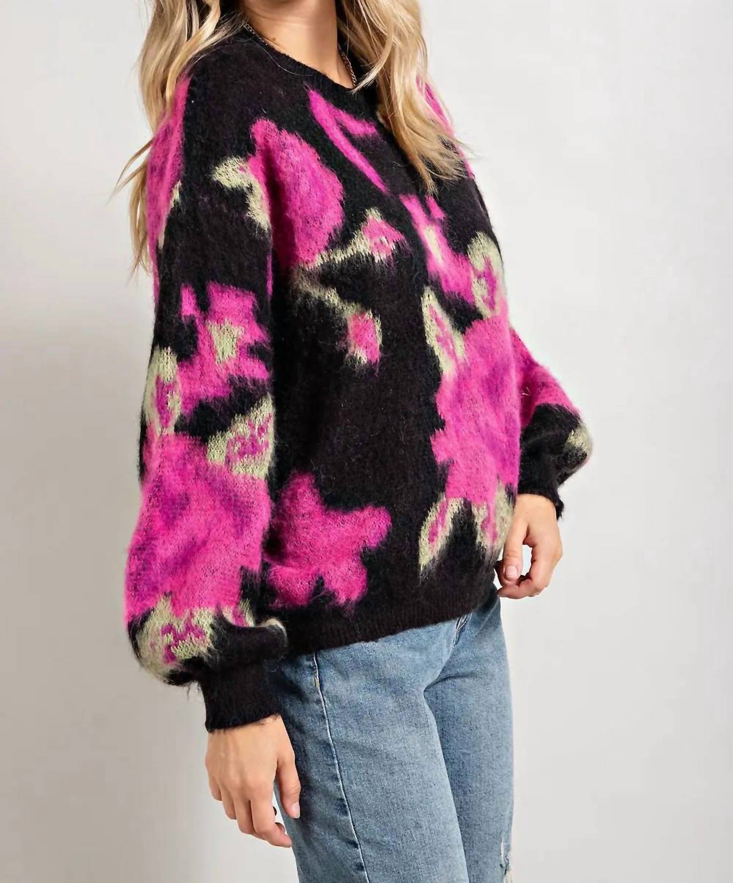 Embrace vibrant style with the Finnegan Fuzzy Flower Sweater by 143 STORY, a perfect addition to your colder weather wardrobe. This piece features a bold floral pattern in black, bright fuchsia, olive, and purple with long puff sleeves and a classic crewneck. Crafted from a blend of 50% Acrylic, 35% Nylon, and 15% wool, it offers a super fuzzy and soft texture. Designed with a pull-on closure, care is easy with a hand wash cold and line dry approach.