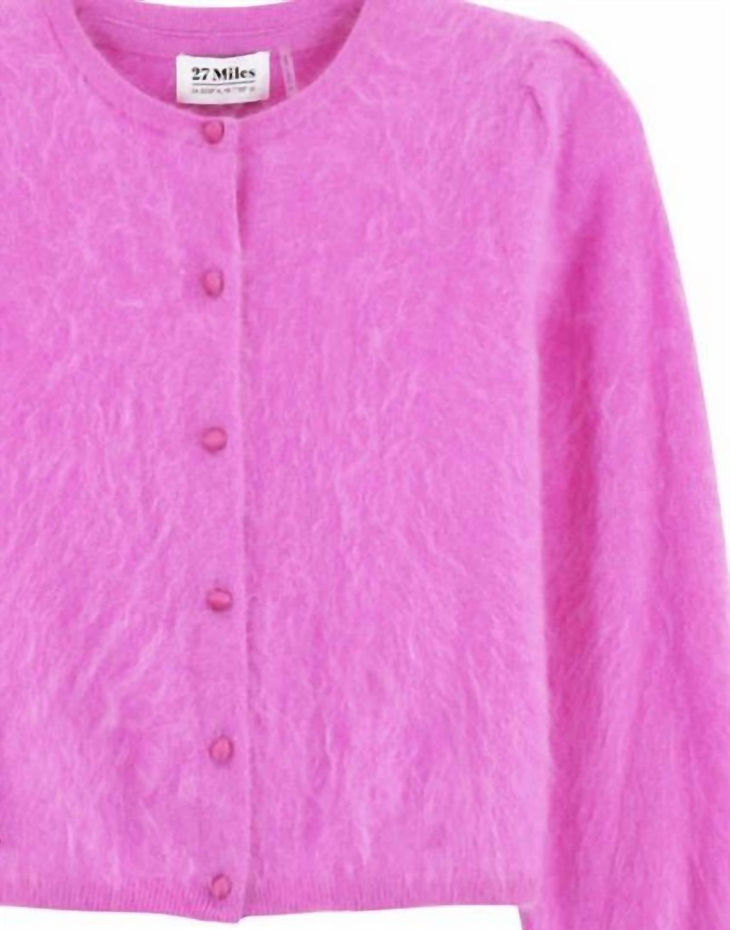 Introducing the Women's Christina Long Sleeve Cardigan by 27 Miles Malibu, a touch of luxury in vibrant fuchsia. This cardigan features long sleeves and a timeless crewneck, making it perfect for versatile layering. Crafted from luxurious cashmere, its textured design ensures both warmth and minimalist elegance. Closure: Button closure.