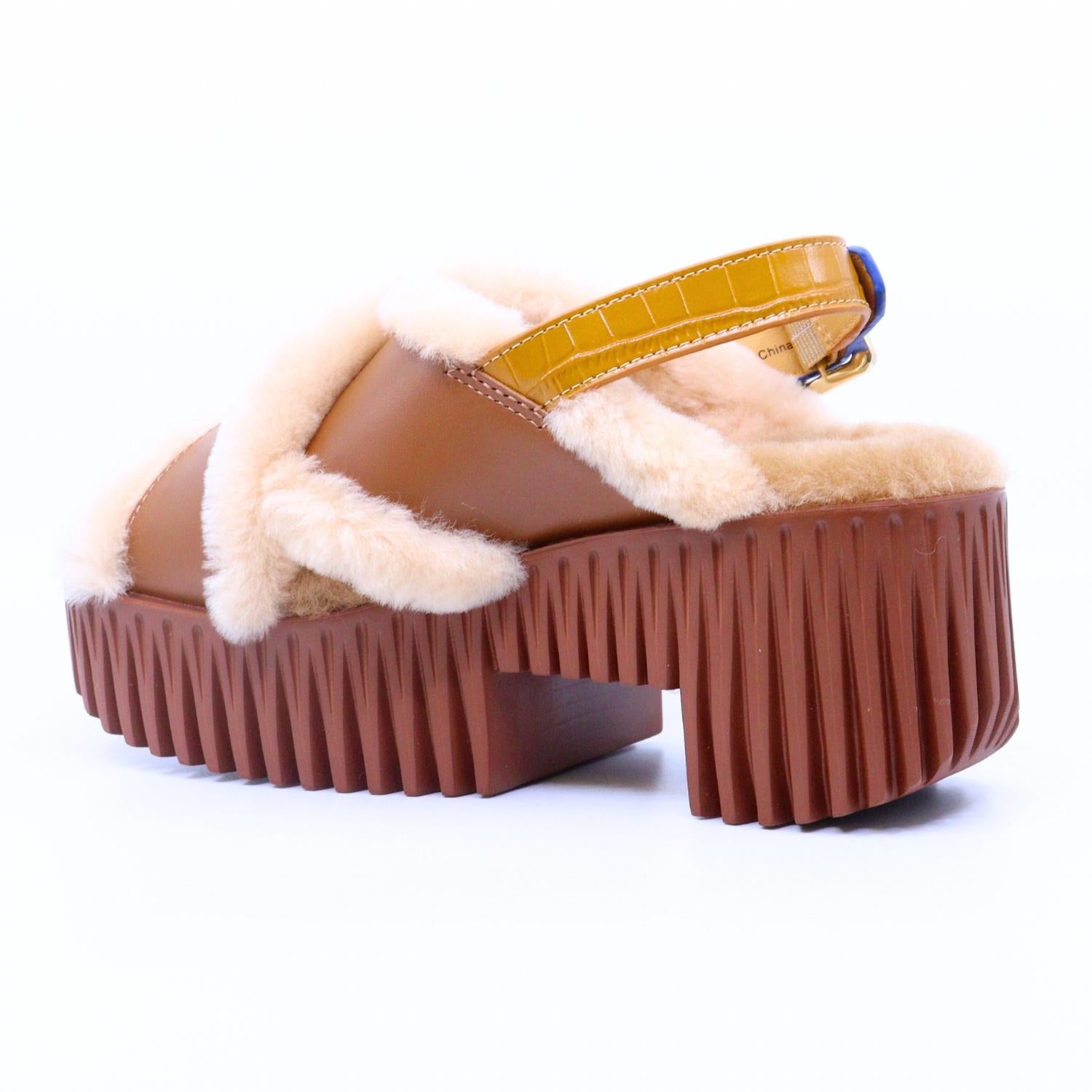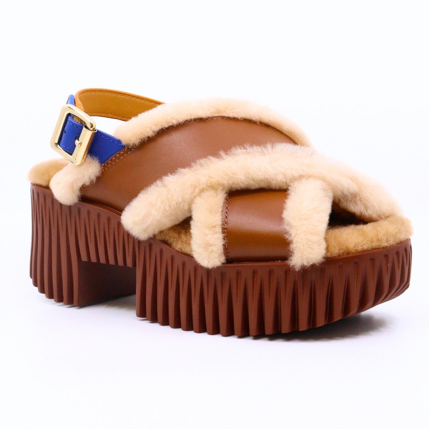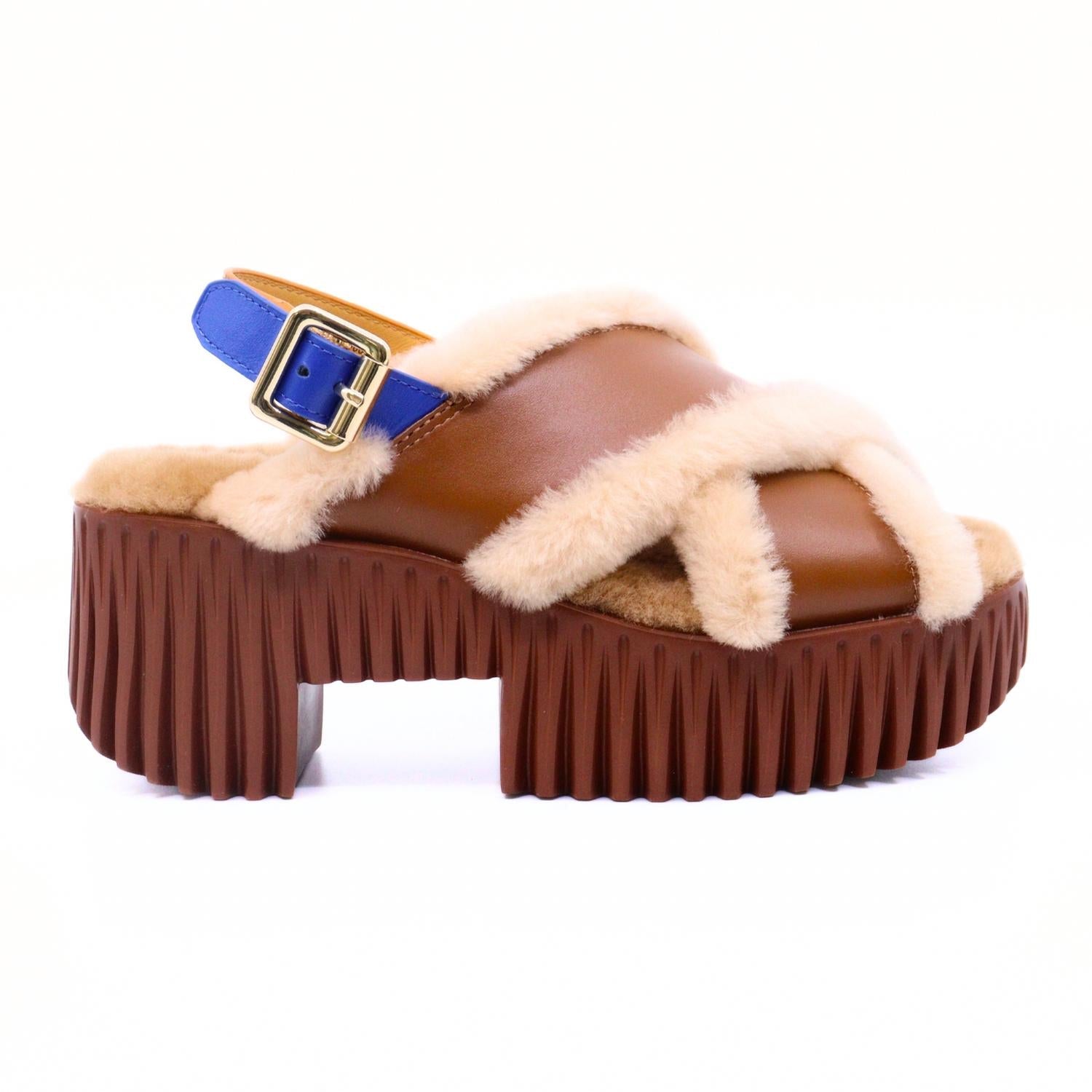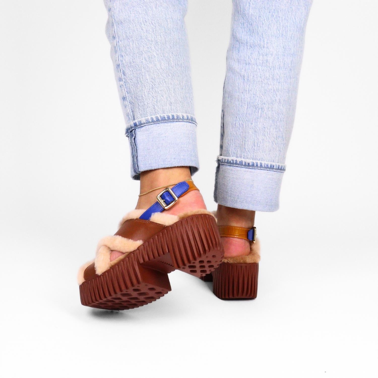 This sandal will take you from brunch to dinner and everything in between. Step into cozy style with the Plia Puffy Sandals by 4CCCCEES in a chic brown hue. Designed for comfort, these sandals feature wide, shearling-lined straps and a lightweight foam rubber flatform sole with a 2.75" heel and 1.5" platform to add height effortlessly. The adjustable blue buckle offers a playful contrast and secure fit. Crafted for women, these sandals fit true to size, ensuring warmth and style through the colder months.