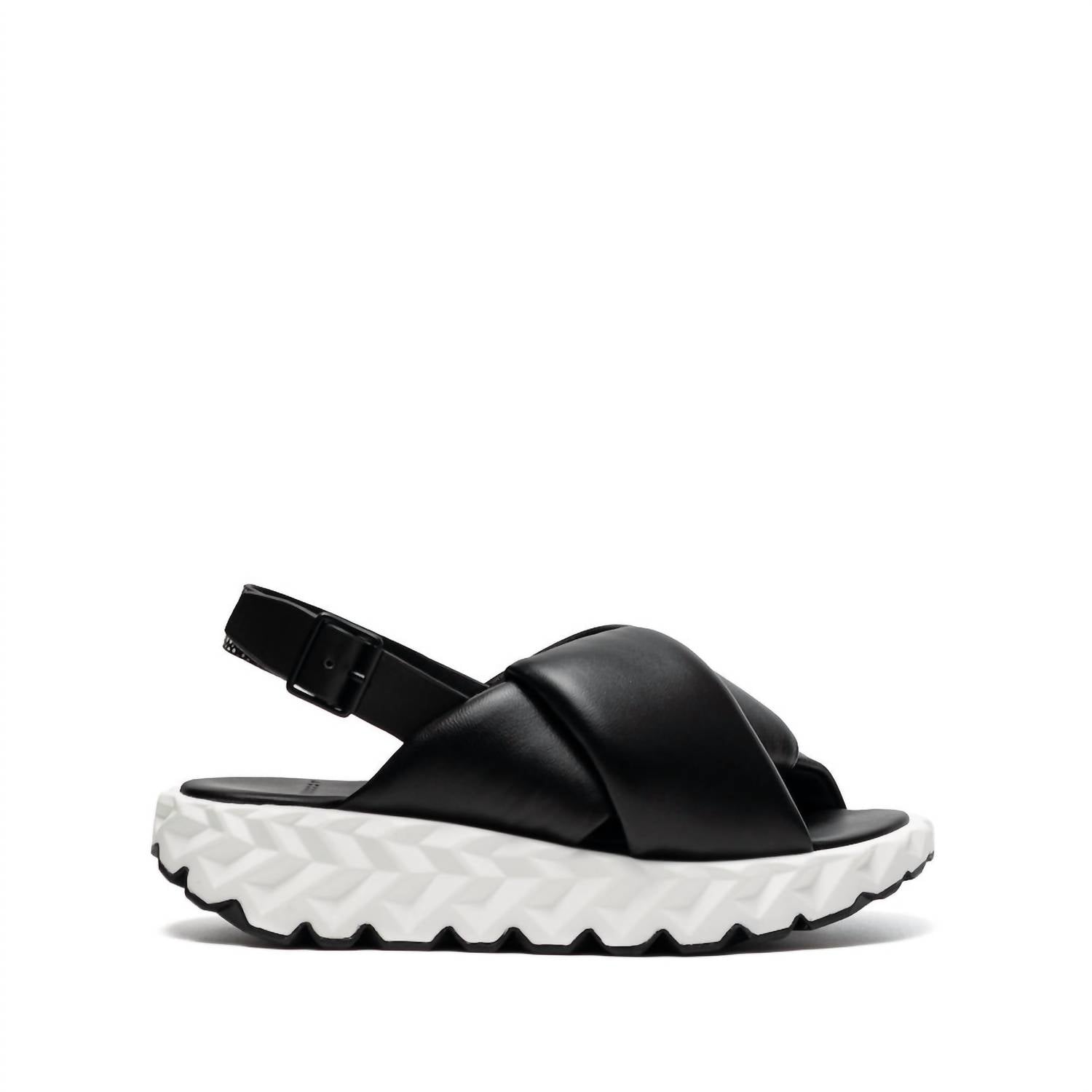 This sandal will take you from brunch to dinner and everything in between. Step up your fashion game with the Women's Jabara Coil Sandals by 4CCCCEES, offering a bold statement for your summer streetwear collection. These sandals feature a sport bottom with a low 1.57" increasing wedge sole complemented by side ribbing, making them an ideal choice for vacation wear. Crafted from soft, supple leather with crisscross puffy detailing, these open-toe sandals combine unique style with comfort. An adjustable backstrap ensures a secure fit, available in a striking Oreo color.