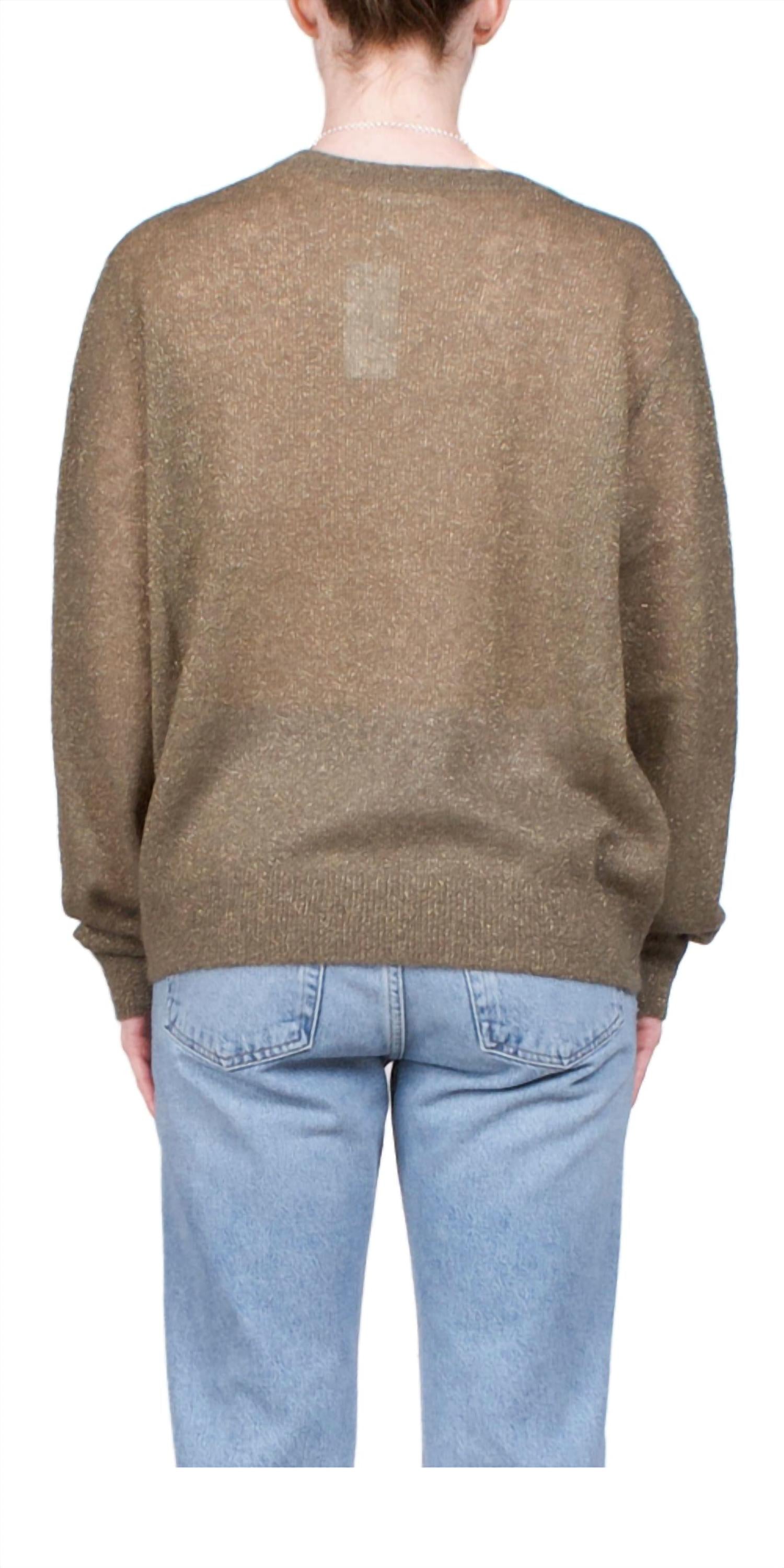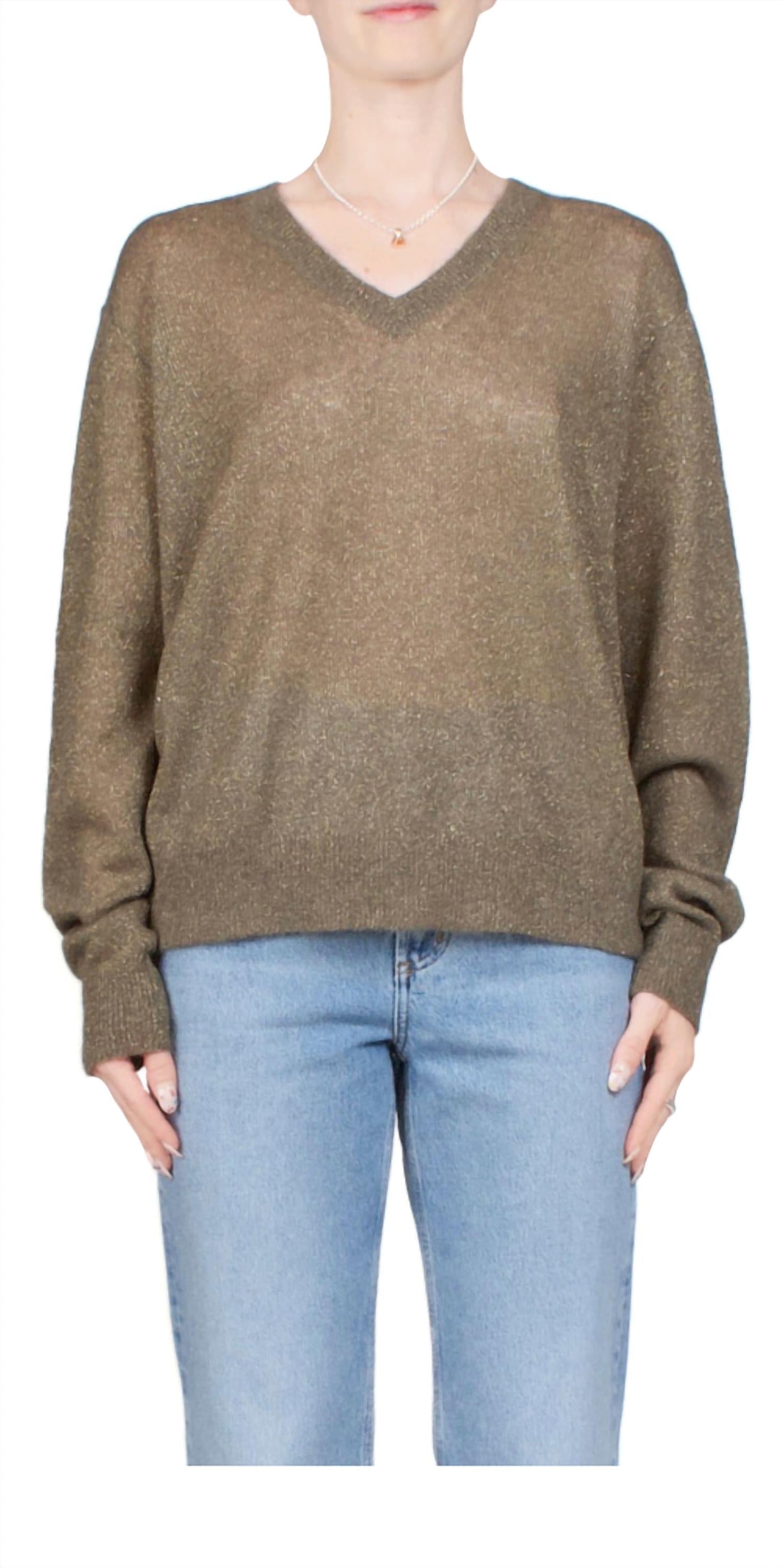 You'll be reaching for this comfy and classic v-neck sweater all season long. Stay stylish and comfortable with the 6397 Classic V-Neck Sweater in Metallic Khaki, an ideal piece for any wardrobe. This long-sleeve sweater is crafted from wool, offering a semi-sheer, lightweight fabric that drapes effortlessly. Featuring a v-neckline, ribbed hem, and cuffs, this sweater is effortlessly elegant. It is a pull-on style designed without pockets.
