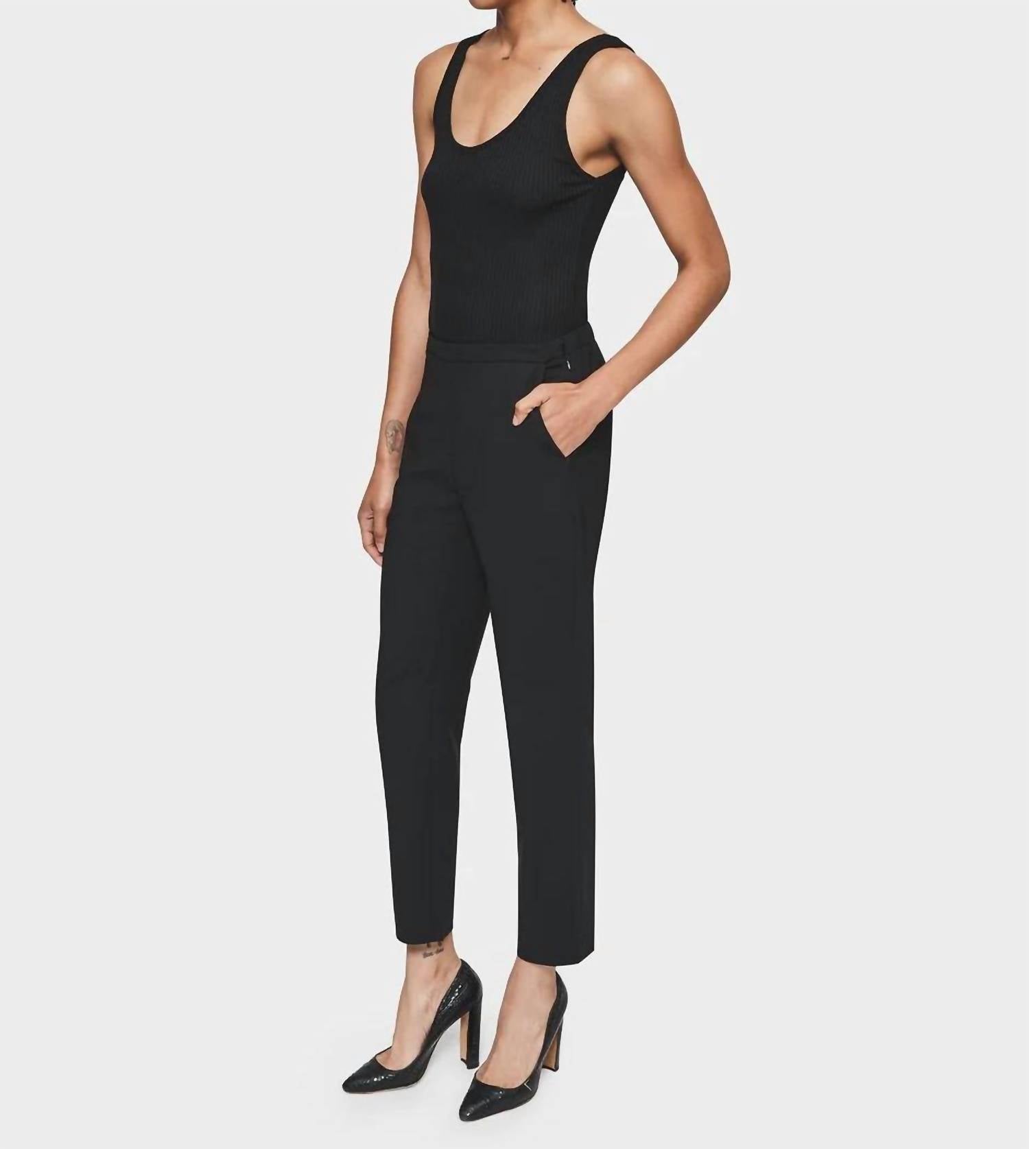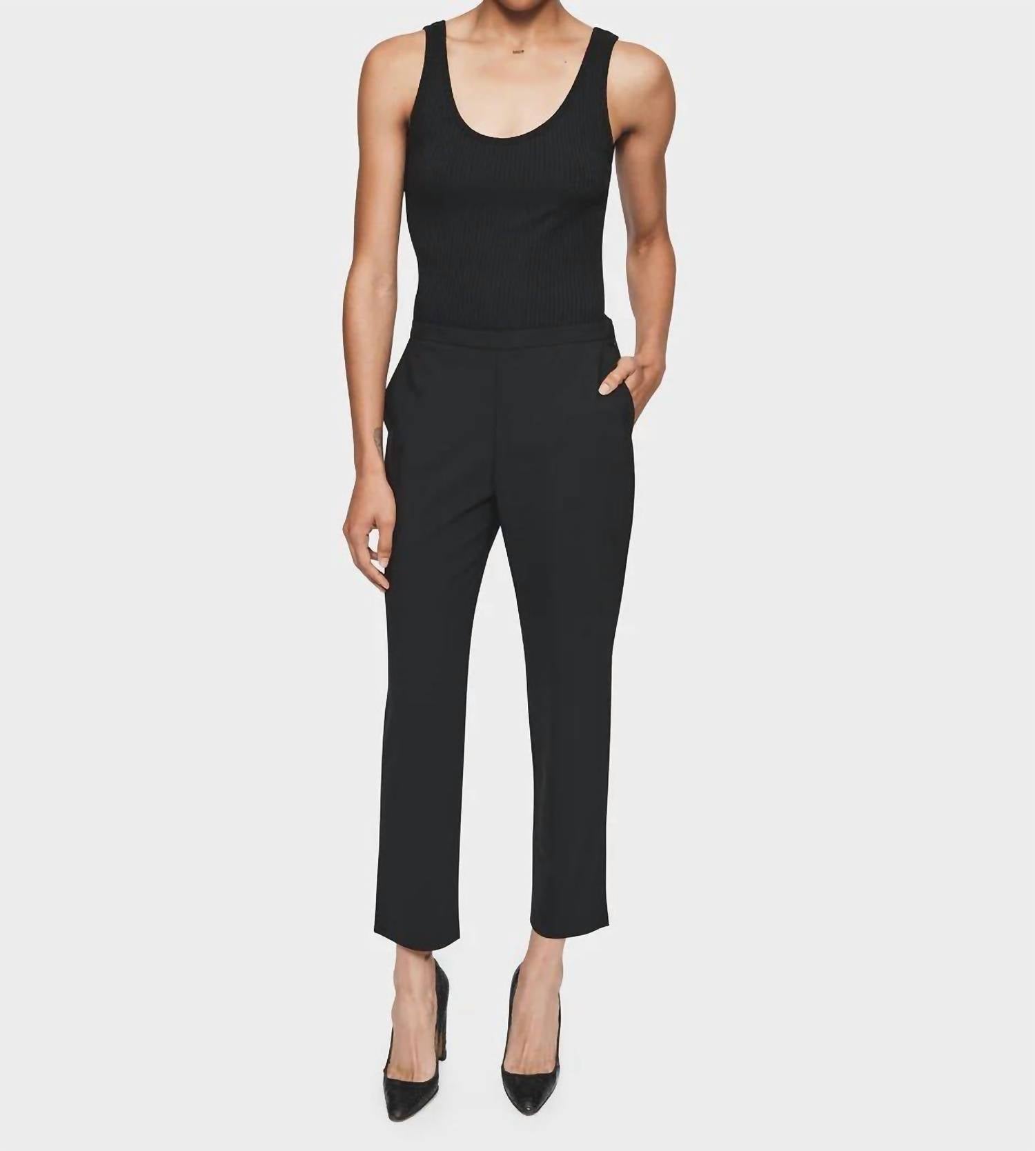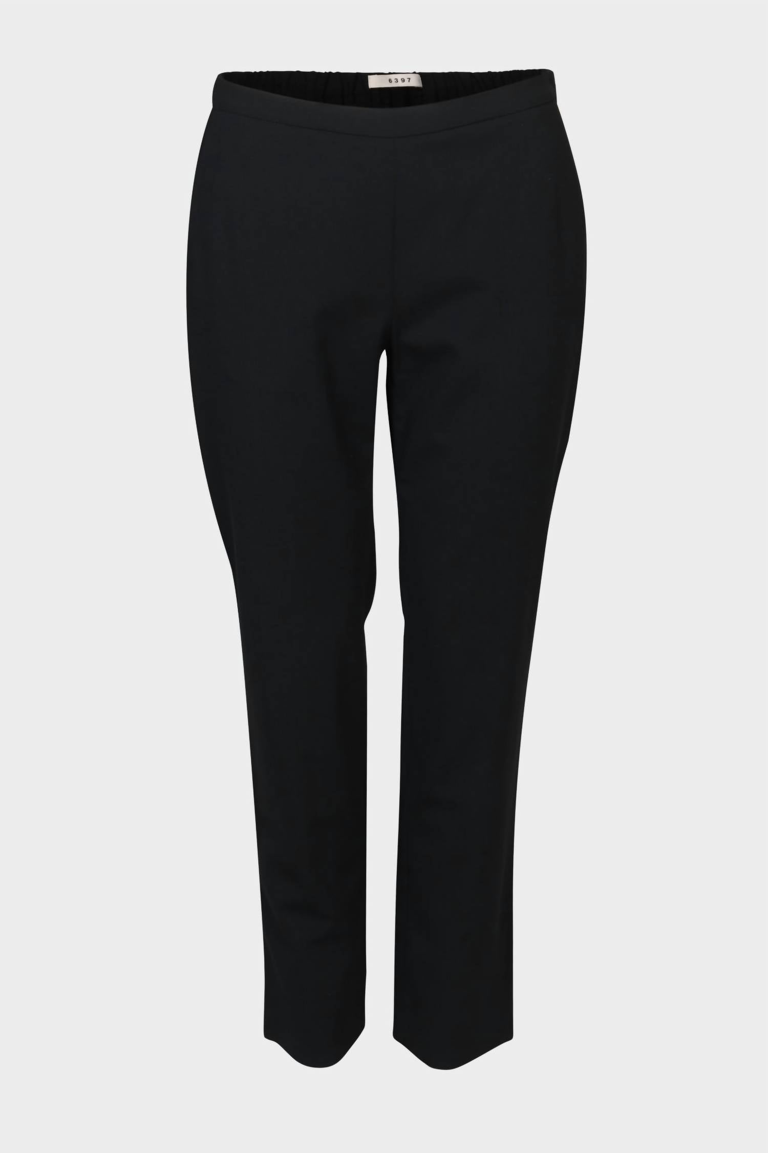 A straightleg pant that workes season after season. Dress these up with your favorite blouse or keep it casual with your go-to tee. Slip into effortless style with the Slim Pull On Pant by 6397, a quintessential straight leg piece in classic black. These women's pants feature a relaxed fit with a slightly cropped length, side pockets, and a convenient side zipper closure with an elastic waist at the back for added comfort. The material is a premium cotton blend consisting of 96% cotton and 4% elastane, ensuring a flattering silhouette. For maintenance, these pants require dry cleaning to keep them looking their best.