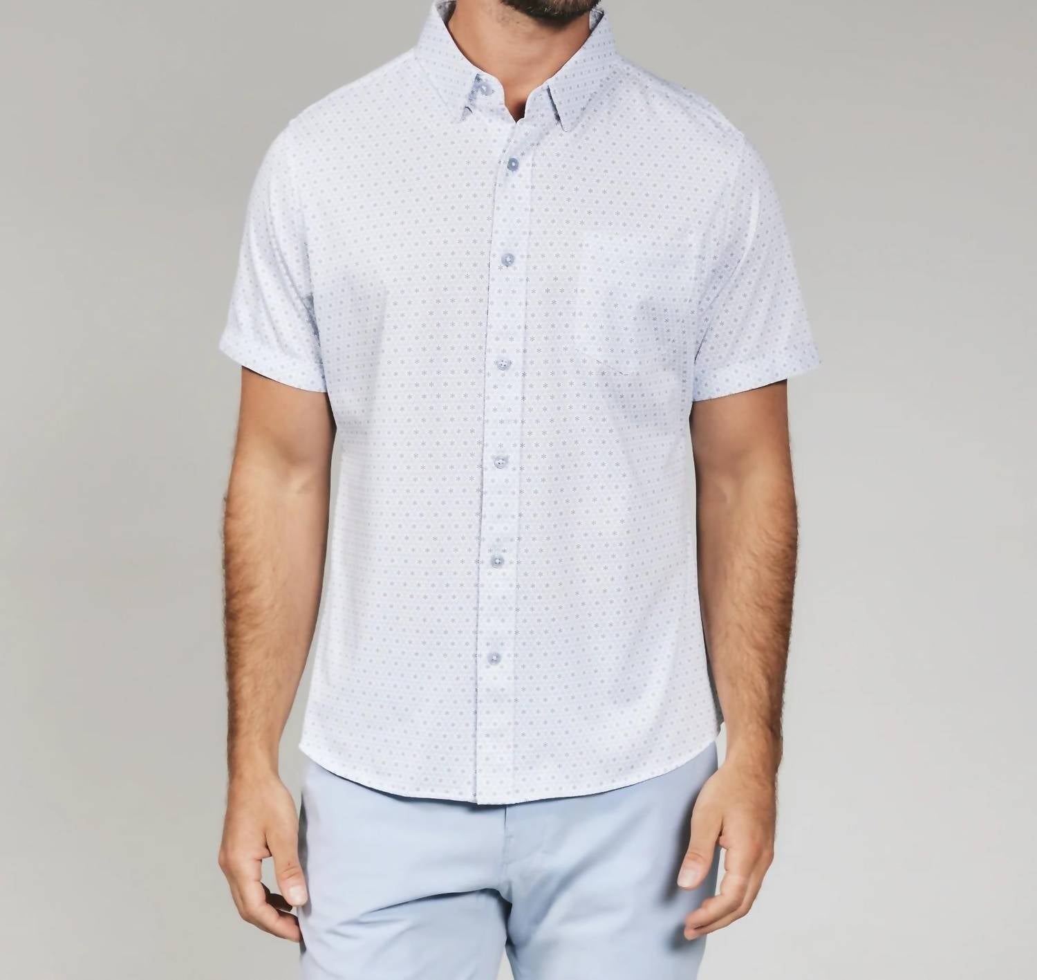Elevate your vacation wardrobe with the Radley Short Sleeve Shirt by 7Diamonds, a stylish choice in light blue. This shirt combines comfort and style with its short sleeves and patterned design. Crafted from 93% Polyester and 7% Spandex, it features a structured knit with a 4-way stretch for a light and airy feel. Easy to maintain, this shirt is machine washable and should be hung to dry. Closure: Button closure. Model is 6'1" and wears a size medium.