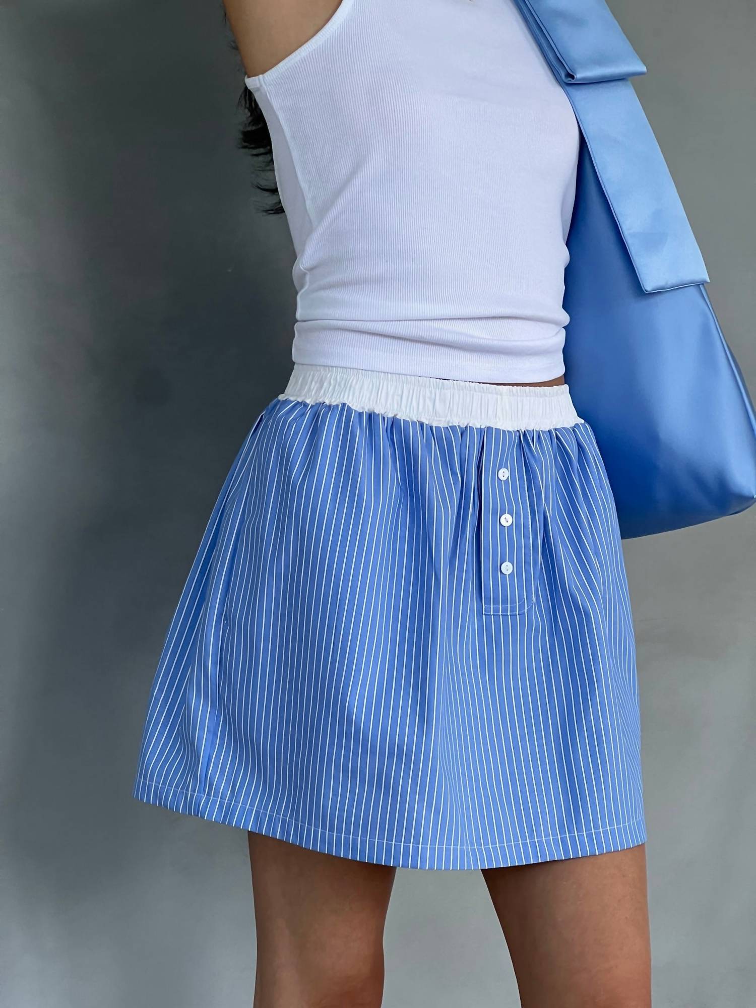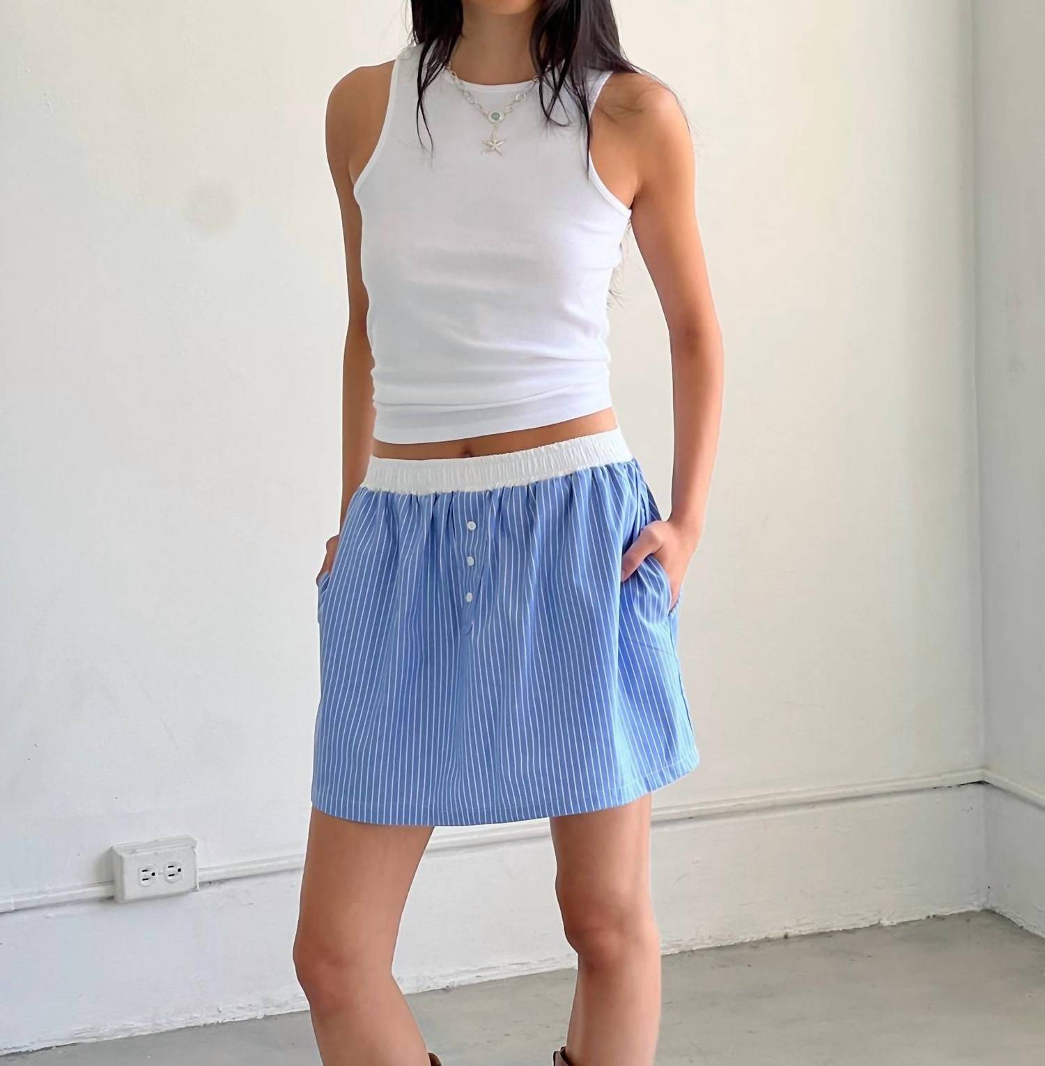 Presenting the Boxer Skirt by A Bronze Age, a charming piece in Porter Stripe perfect for the minimalist summer wardrobe. This mini skirt is crafted from 100% cotton poplin with an elastic waist and features a faux-fly detail for added style. Made in Canada, it offers side seam pockets for practicality and a pull-on closure for ease. Care: Machine wash. Model wears size S.