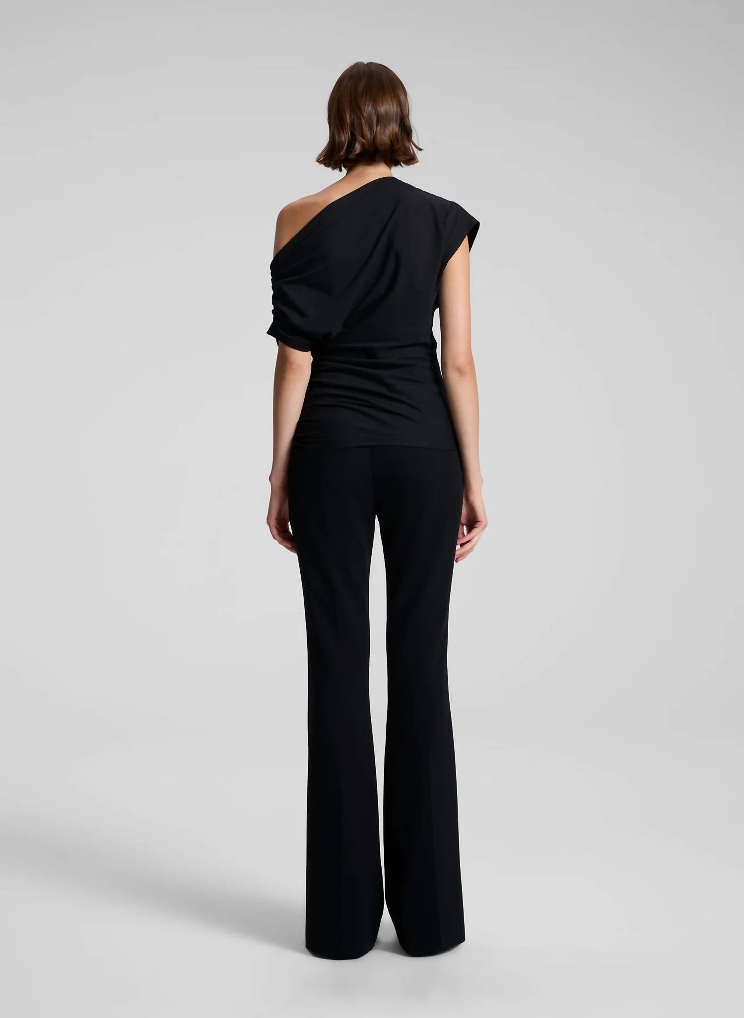 A versatile blouse that works from desk to dinner! Elevate your wardrobe with the Alice One Shoulder Top by A.L.C., a chic addition to any monochromatic look. This top features a short sleeve and an off-the-shoulder design, exuding a modern and structured appeal with its ruched side and one-shoulder silhouette. Crafted from a clean finish jersey fabric in solid black, it perfectly combines style and elegance. Ideal for spring vacations or a Thanksgiving gathering, this blouse is a must-have for the trend-conscious woman.