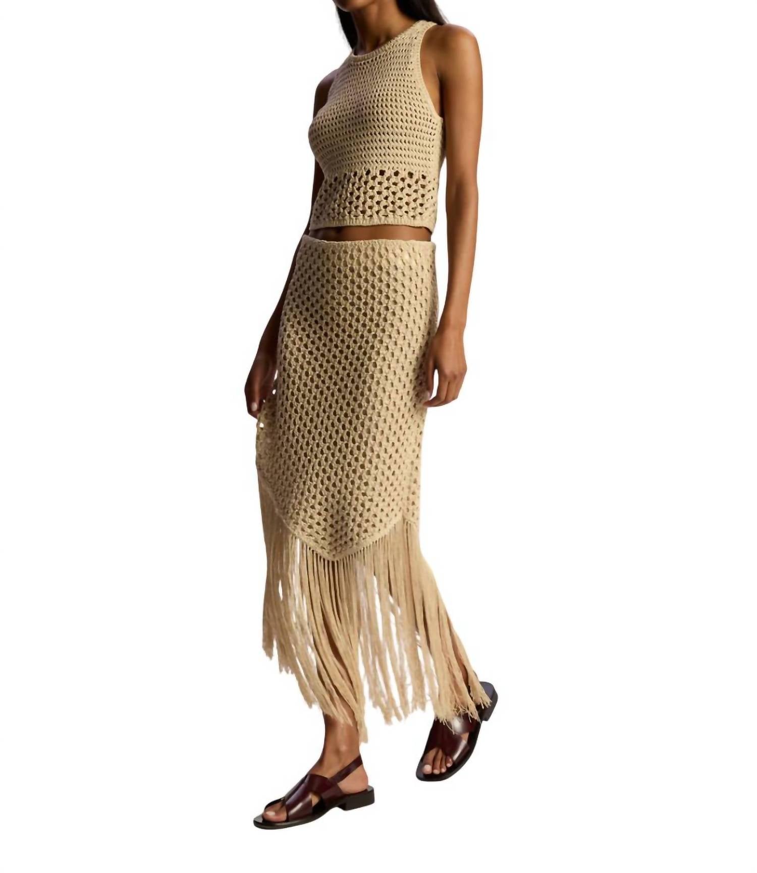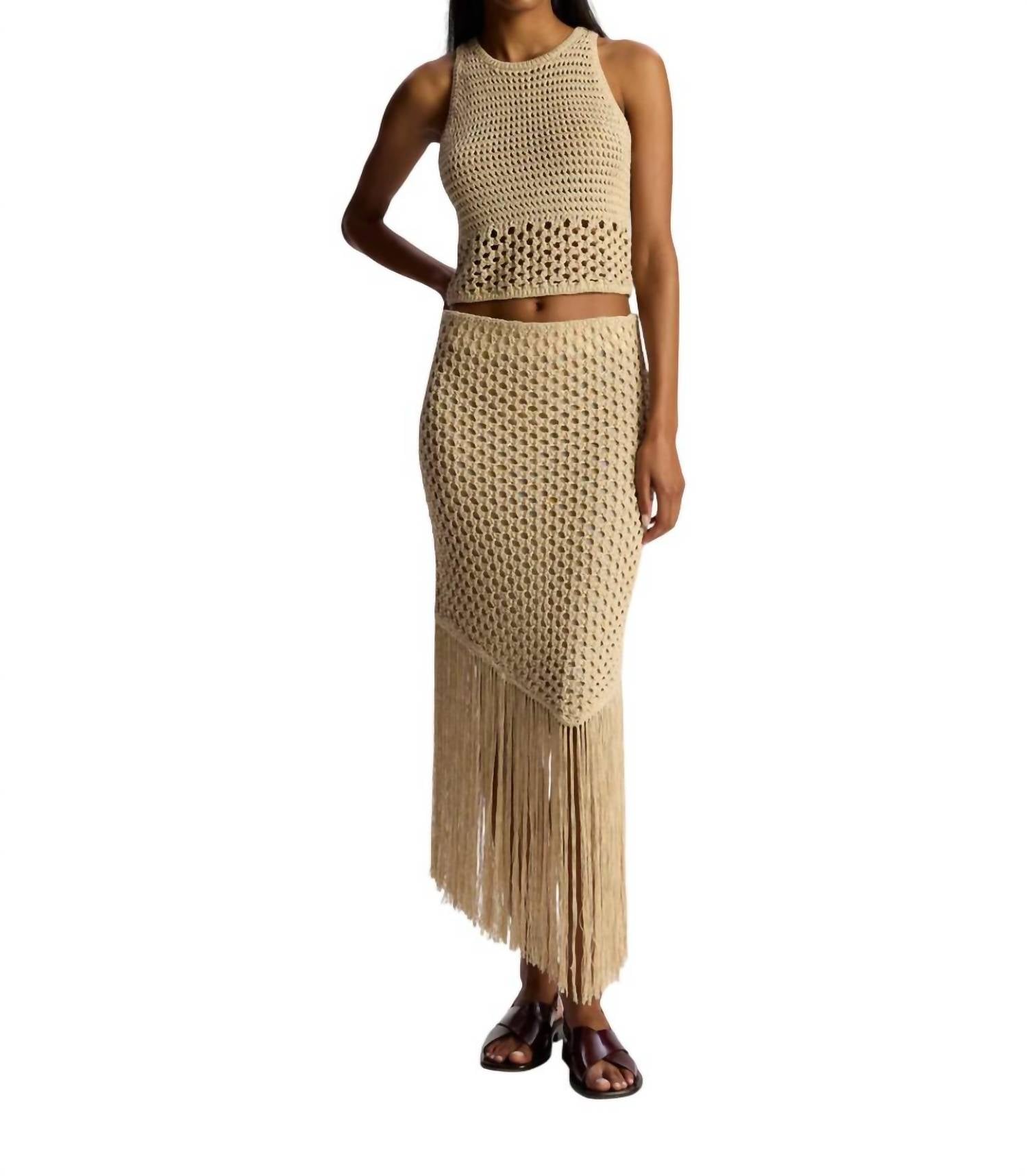 Features a viscose cotton fringe in a natural pampas hue. Sleeveless silhouette. High rounded neck. Bold crochet detailing throughout. 53% Viscose, 47% Cotton. True to size. Hand Wash.