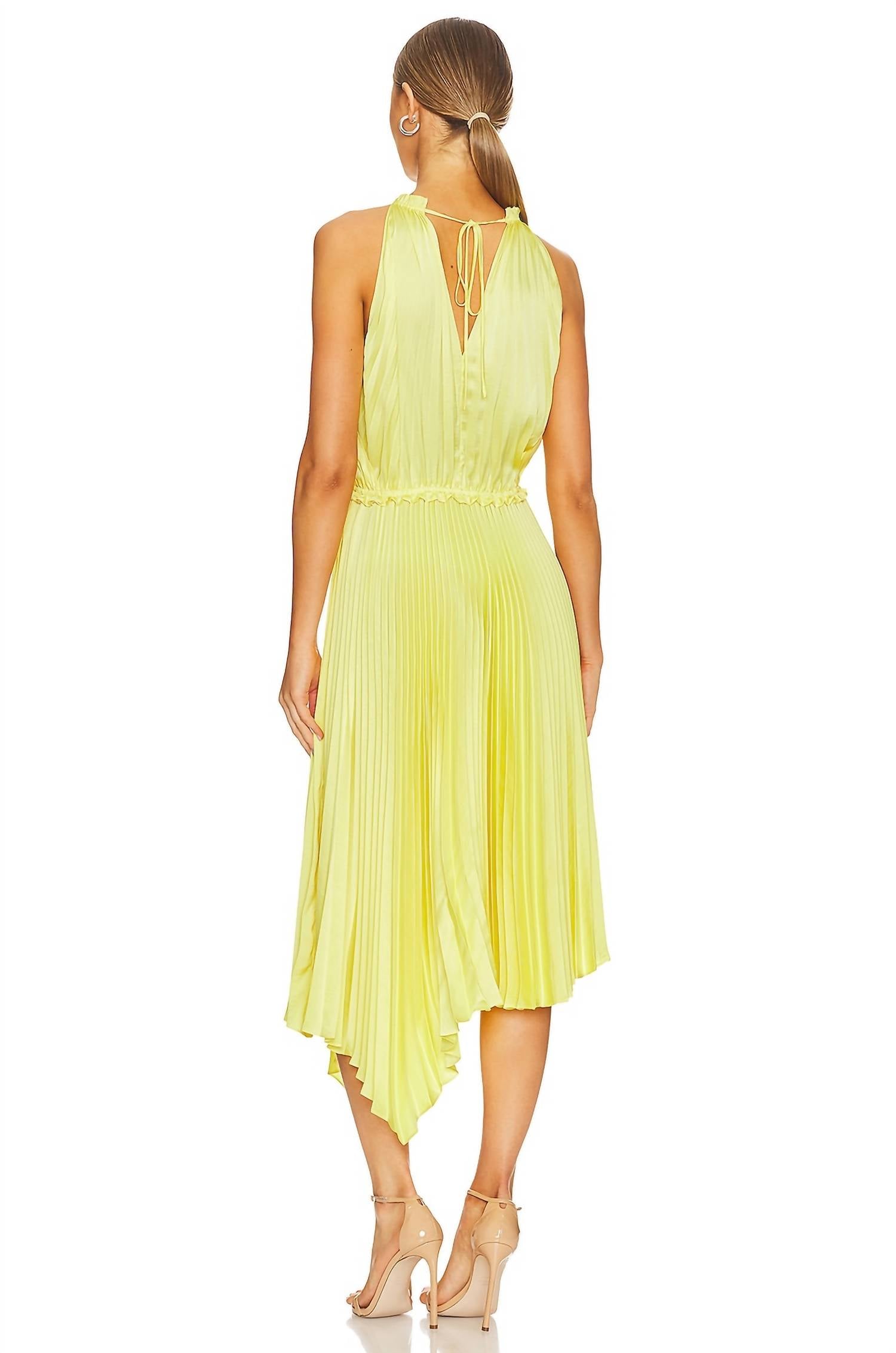 A dress you'll be reaching for season after season. Pair it with your favorite denim jacket for a more laid-back look. Embrace the elegance of the Claudia Dress by A.L.C., a sleeveless masterpiece crafted for the modern woman. This daffodil dress is made from 100% polyester pebbled satin, showcasing an asymmetrical midi silhouette with a stunning handkerchief hem and halter neckline. Designed with a ruffled waist detail, it's perfect for spring occasions. Care: Machine wash cold in a net bag on a gentle cycle, line dry, and use a cool iron if needed.