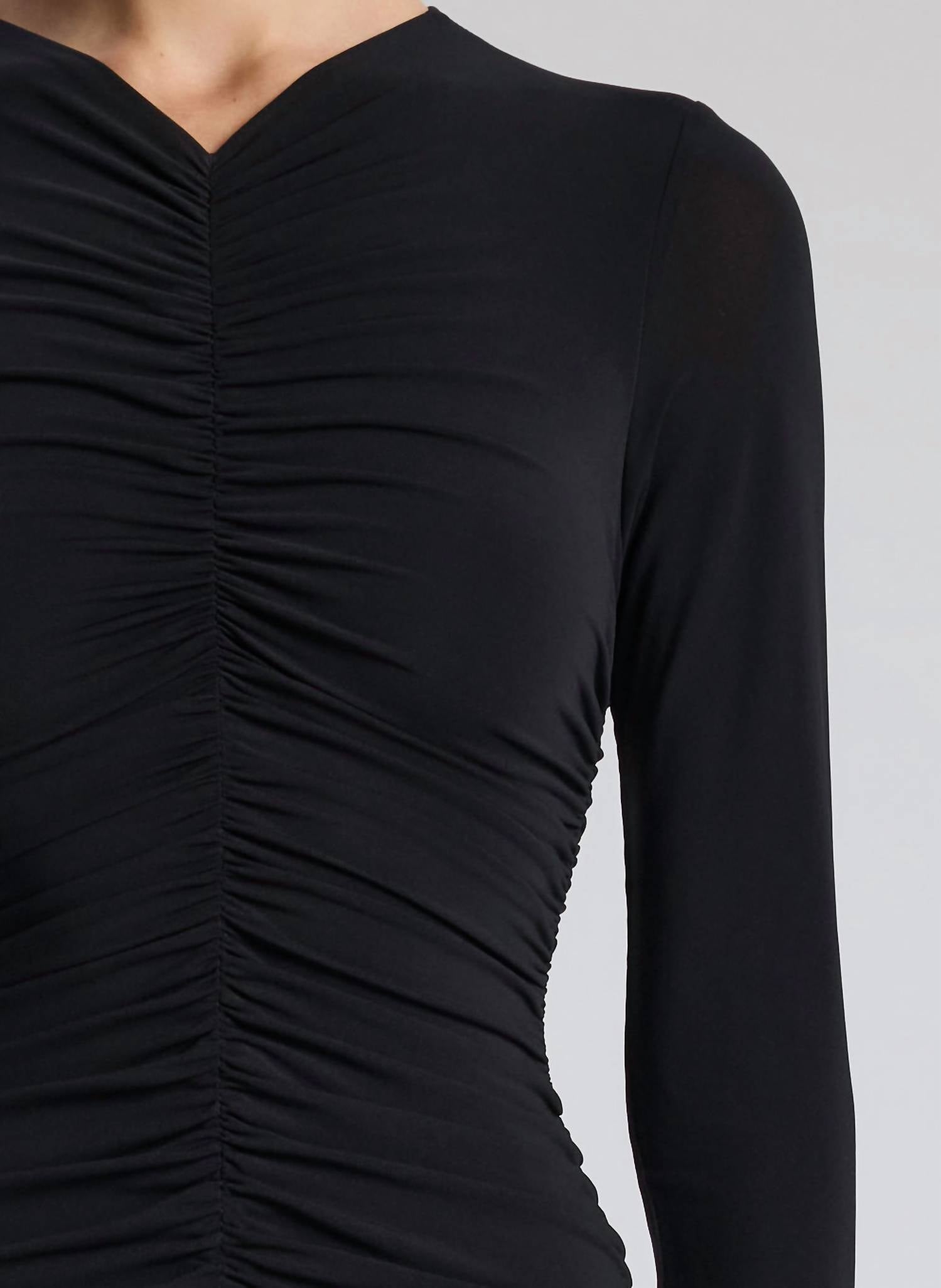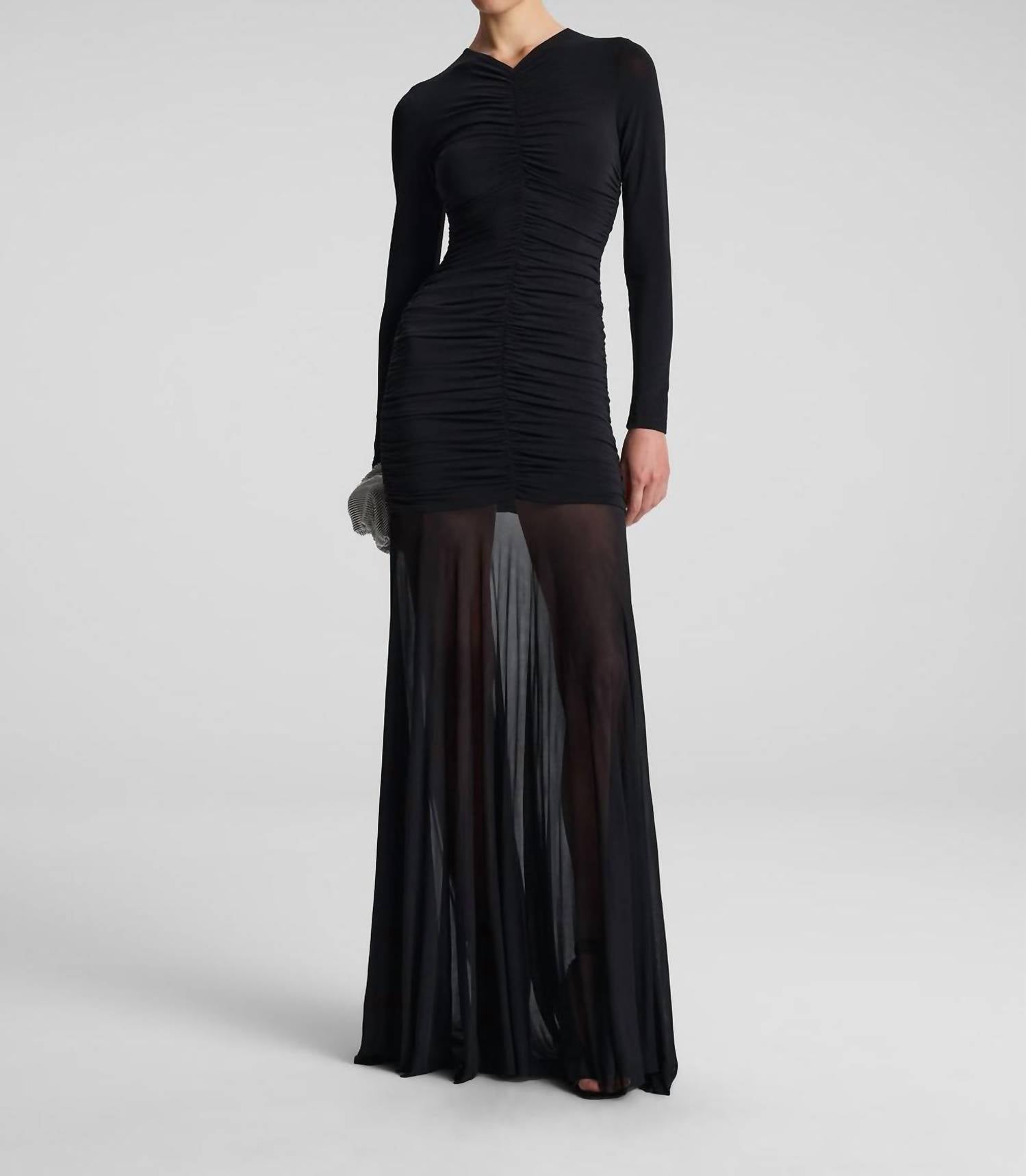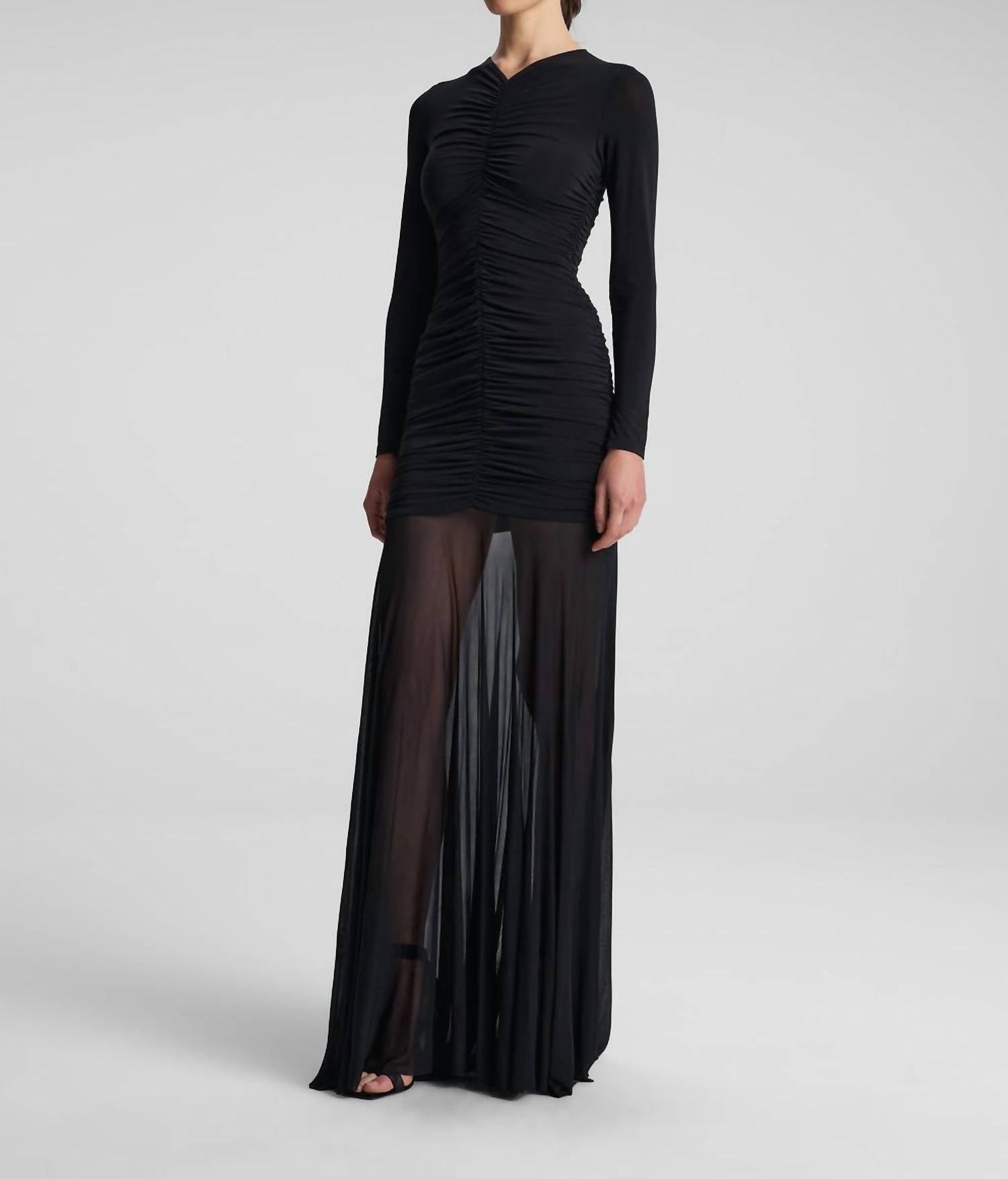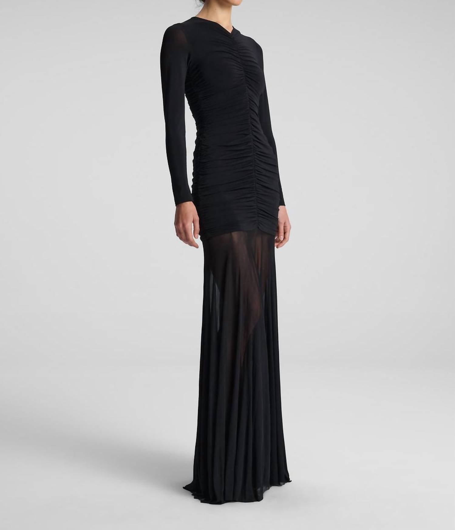 Style this maxi with your favorite statement necklace and sandals for the perfect look. Experience elegance with the Fawn Ruched Dress by A.L.C., a sophisticated maxi in timeless black. This dress features long sleeves and a chic v-neck design, crafted from a luxurious jersey blend for a sheer, full-length silhouette. Composition: 100% Rayon, with contrast fabric of 71% Viscose, 21% Polyester, and 8% Elastane. Closure: Convenient zip closure. Care: Dry clean only. Length: 53.75". Model is 5'11" and wears size S.