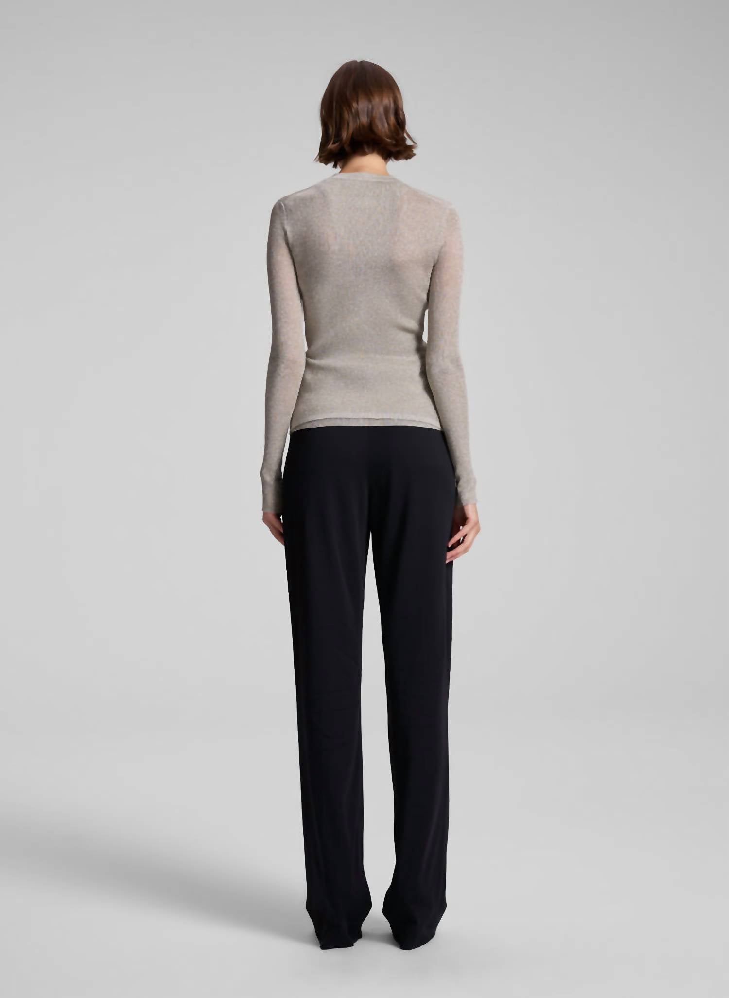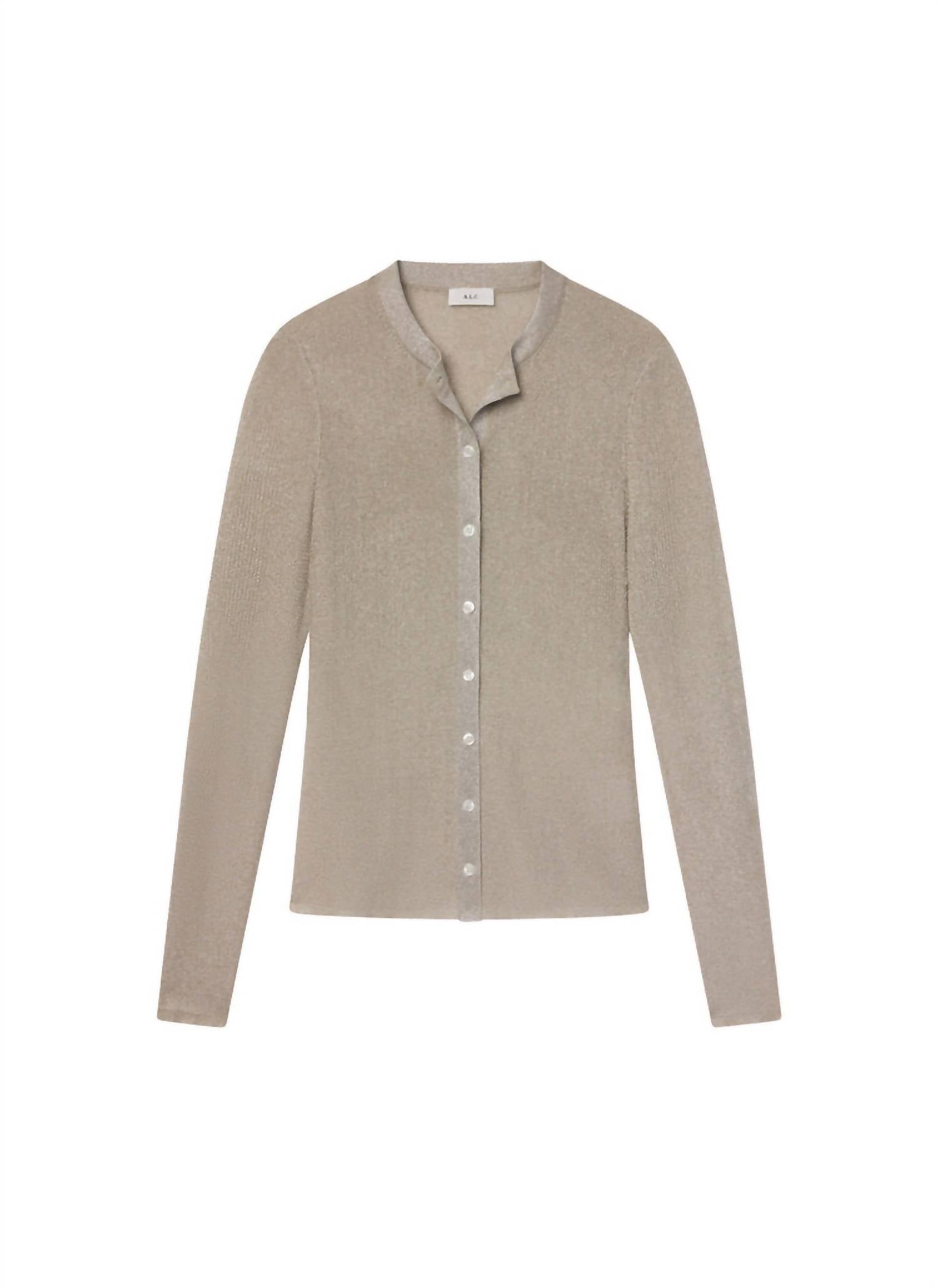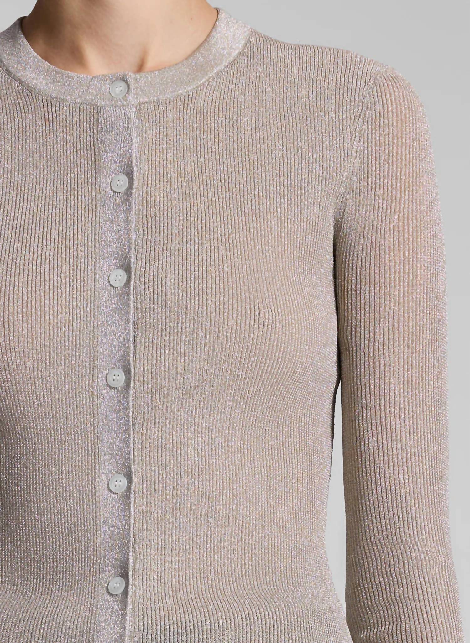 Throw this adorable cardigan over any cami or tank top. Introducing the A.L.C. Fisher Fine Lurex Cardigan, a light gold statement piece for sophisticated layering. With its long sleeves and button-front closure, this sparkly ribbed cardigan features a fitted silhouette that elegantly sits at the hip. Crafted from 100% polyester, it ensures a sleek and polished look. This import is designed for easy sophistication and must be dry cleaned to maintain its luxe texture.