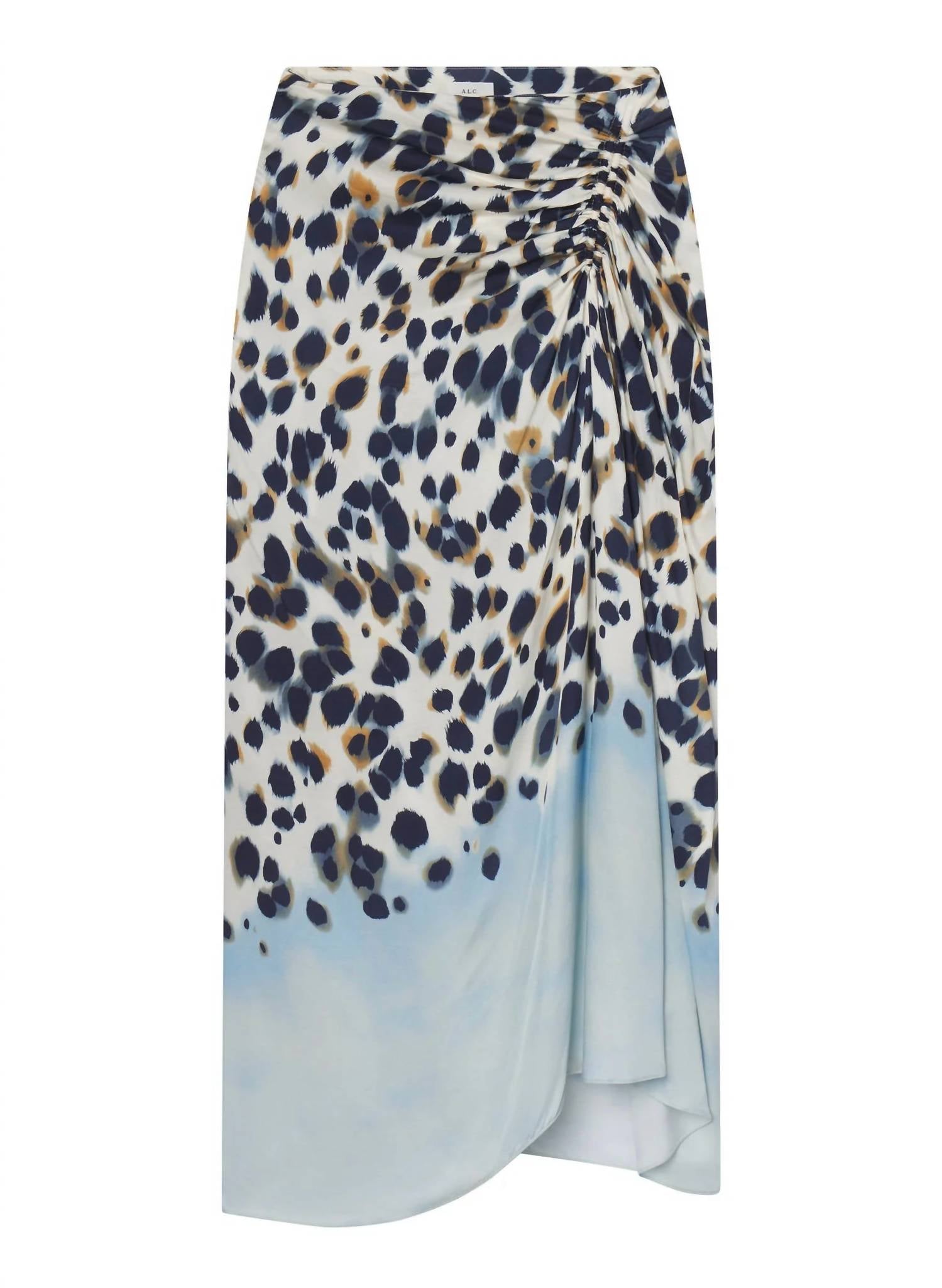 Show off just the right amount of skin in this beautifuly designed midi length skirt. Introducing the Grace Printed Midi Skirt by A.L.C., a stunning piece in a blend of navy and light blue designed for refined elegance. With a length of 34.5 inches, it boasts a high-rise, mid-length silhouette crafted from 100% viscose twill, perfect for adding movement to your outfit. This skirt features gathered detailing and an A-line asymmetrical front that enhances its fluidity. Closure is with a zip, and it requires dry cleaning to maintain its exquisite quality. Model is 5'10" and wearing a size 4.