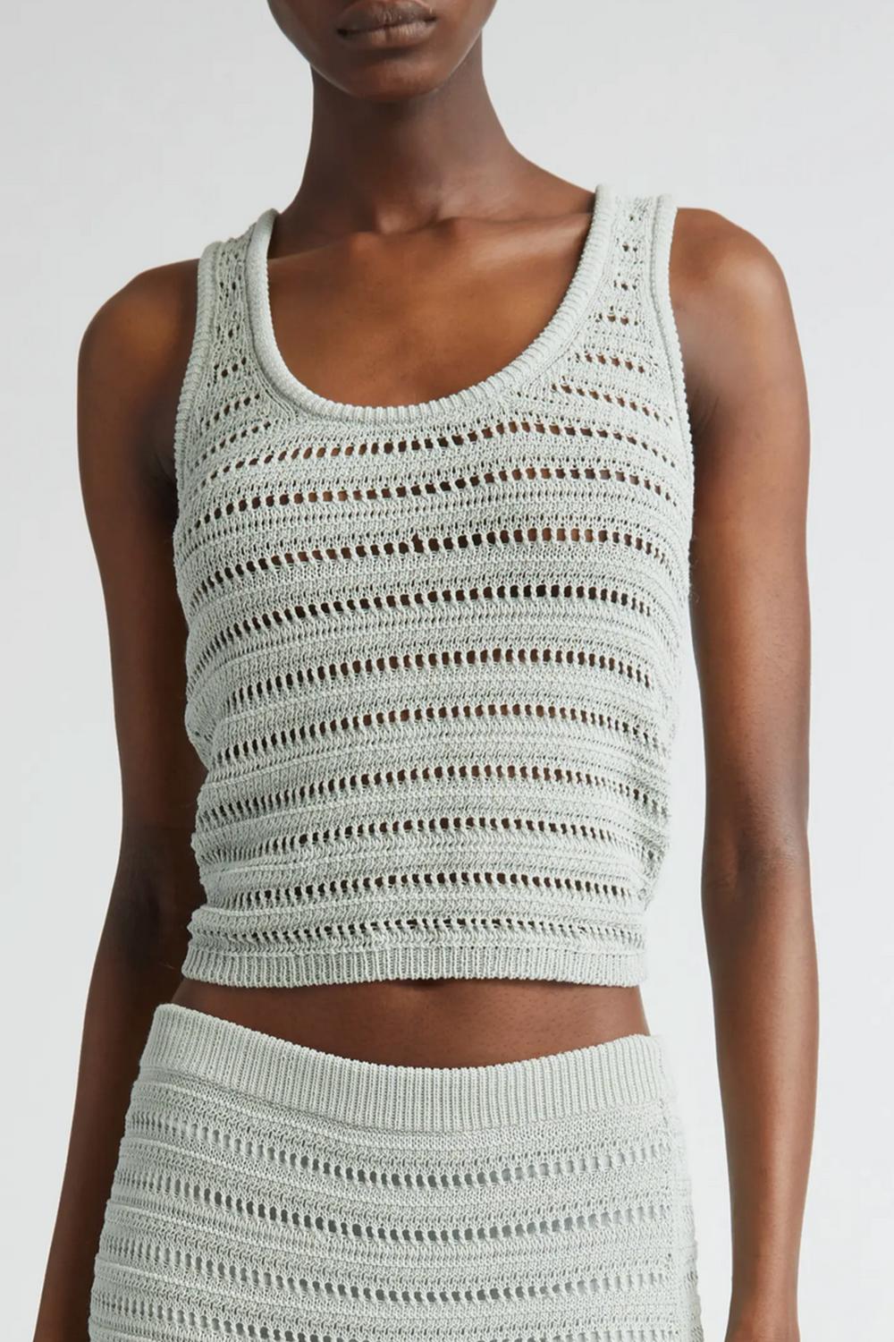 The perfect crop top for those warmer weather days. Introducing the Kira Top by A.L.C., a stunning sleeveless crop top in the elegant Cascade color, perfect for an elevated wardrobe. Made from a luxurious blend of 75% cotton and 25% nylon, this textured piece offers lightweight comfort with a subtle metallic sheen. The sophisticated design is highlighted by its scoop neckline and racerback, complete with banded ribbed detailing at the hem. Pull on. Dry clean only.