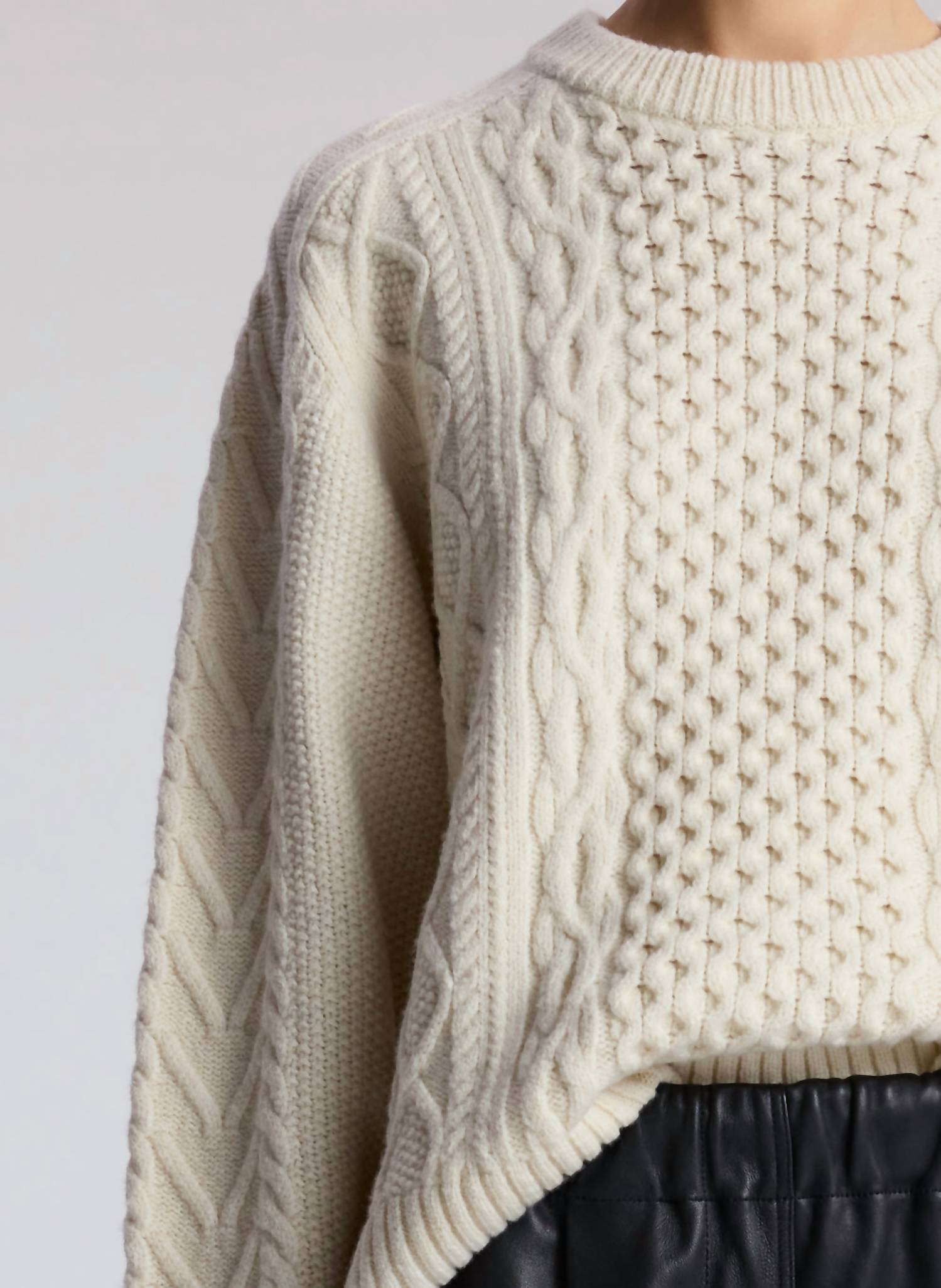 The ultimate go-to sweater, expertly crafted to provide the perfect combination of warmth and style. Its classic design and soft fabric make it a must-have addition to your wardrobe. Elevate your wardrobe with the Kyra Sweater by A.L.C., a stylish piece in an elegant off-white. Crafted from a luxurious merino blend, this sweater features a classic crewneck and long sleeves. The textured pattern adds sophistication, while the pull-on closure ensures easy wear. Care for it with dry cleaning to maintain its pristine condition.