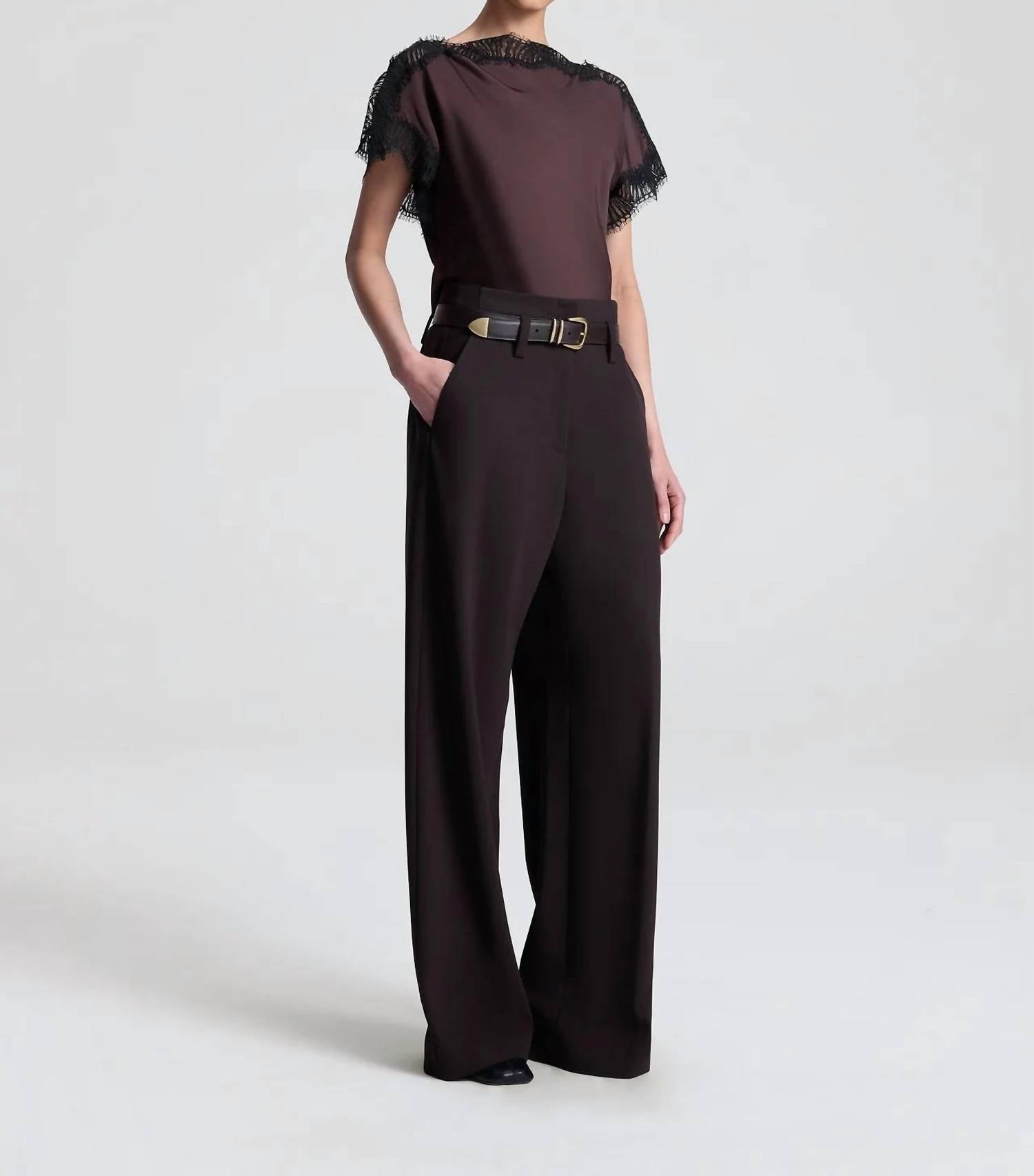 Introducing the Luna Lace Trim Top by A.L.C., an exquisite addition in enchanting Cocoa for your autumn wardrobe. This blouse features short flutter sleeves and a sophisticated bateau neckline, beautifully accented by scalloped eyelash lace trims. Enjoy the fluid drape of 100% Viscose with a contrast of 100% Polyester, perfectly tailored to a stylish 19" length. The pull-on style ensures easy wear, and for best results, dry clean as suggested.