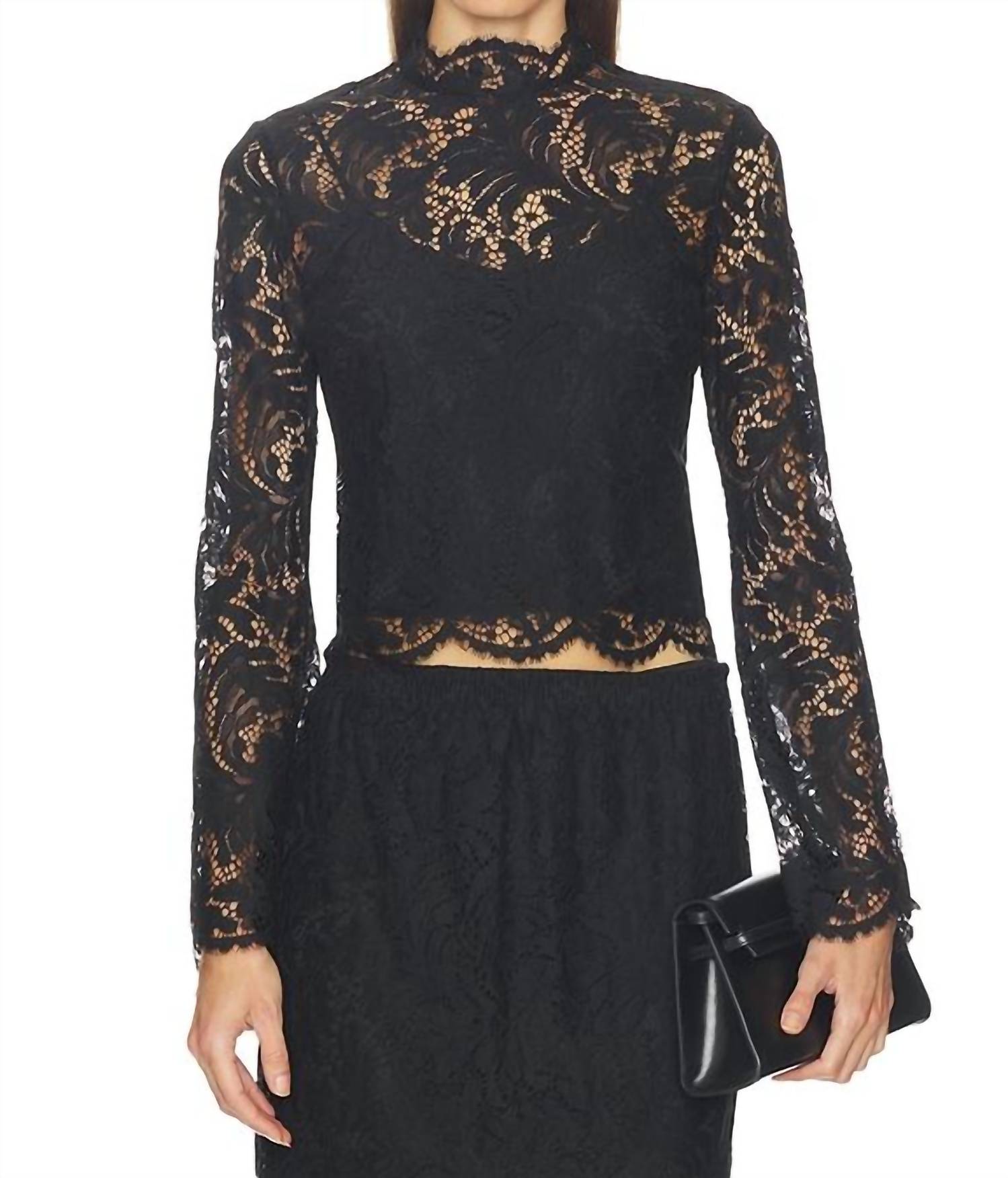 Discover the Margot Lace Top by A.L.C., a modern twist on a classic lace blouse in sophisticated black. Featuring long sleeves, this elegant piece is crafted from 60% nylon and 40% cotton with a lining of 100% polyester, boasting archival French lace with a delicate botanical motif. Designed with a zip closure and back keyhole vent, its 20.25" length fits beautifully for special occasions. Care instructions recommend dry cleaning to maintain its refined appearance. Model is 5'11" and wearing a size 2 (Bust 30", Waist 23", Hips 34.5").