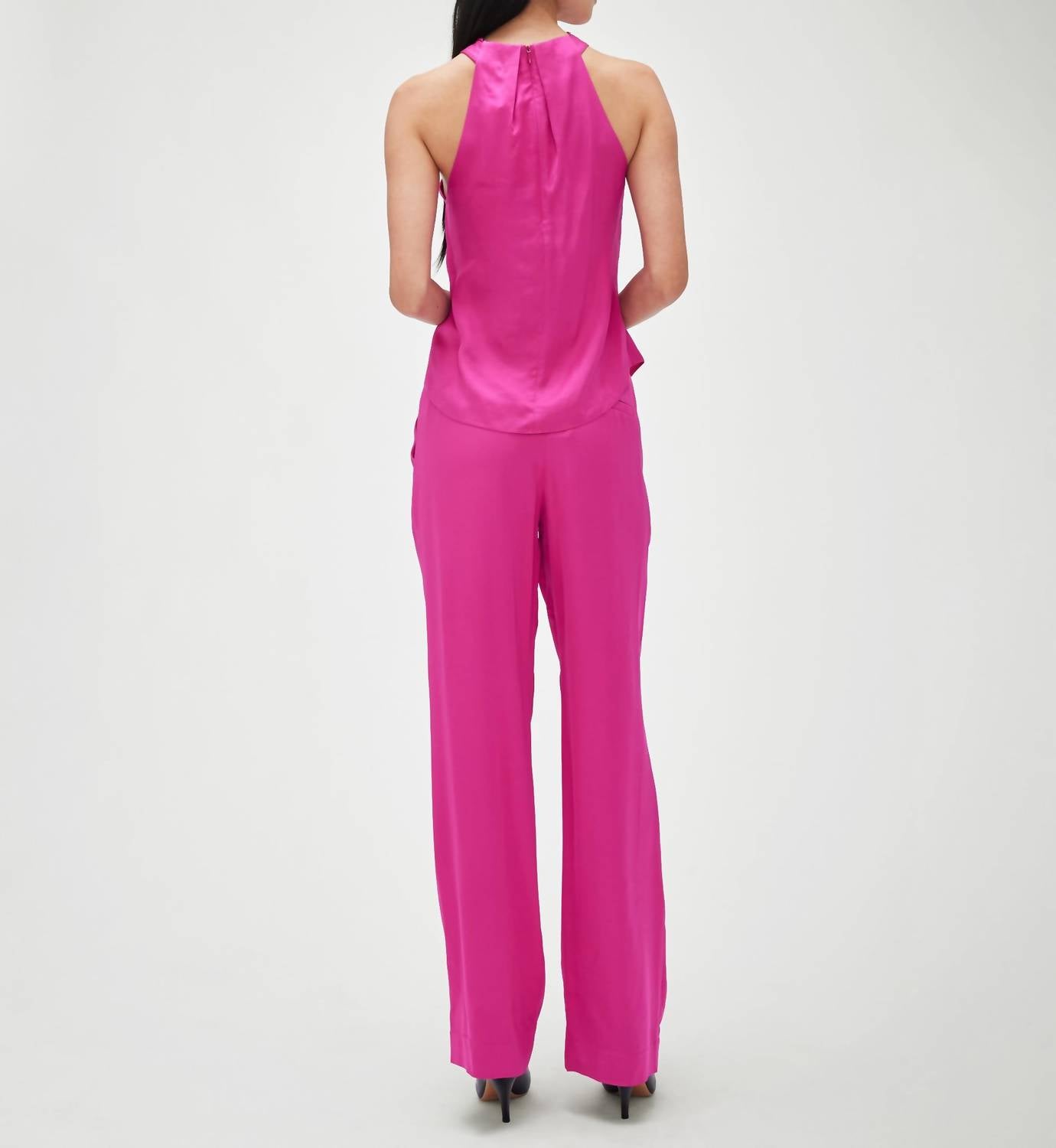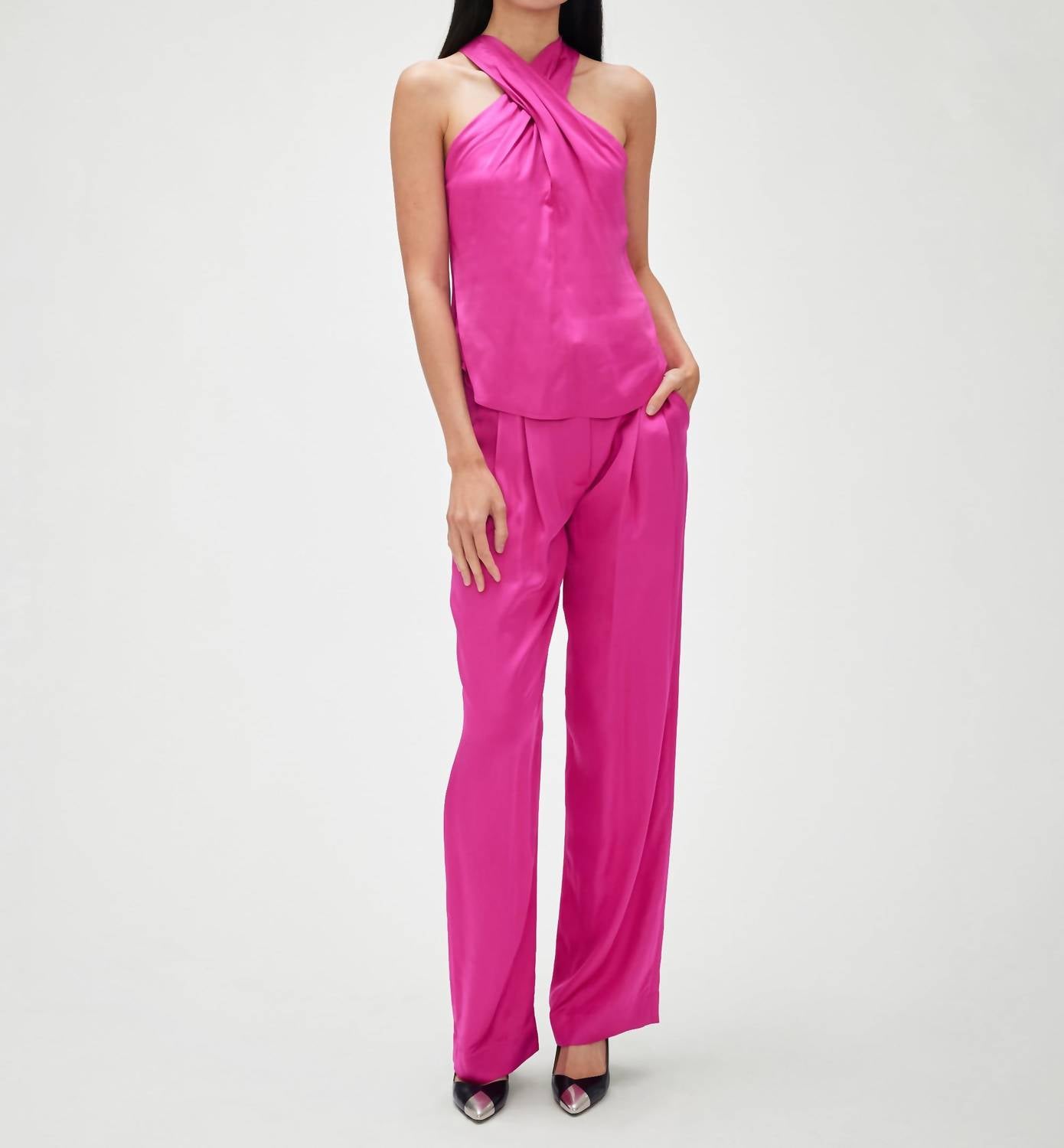 A timeless blouse that will never go out of style. Elevate your spring wardrobe with the Miranda Halter Top in Disco Pink by A.L.C., an ideal choice for festive celebrations. This sleeveless blouse showcases a crisscross neckline, crafted from a luxurious sateen fabric. Made with 88% acetate and 12% polyester, it features a hidden back zipper closure for a seamless fit. For care, dry clean the garment to maintain its vibrant color and impeccable finish.