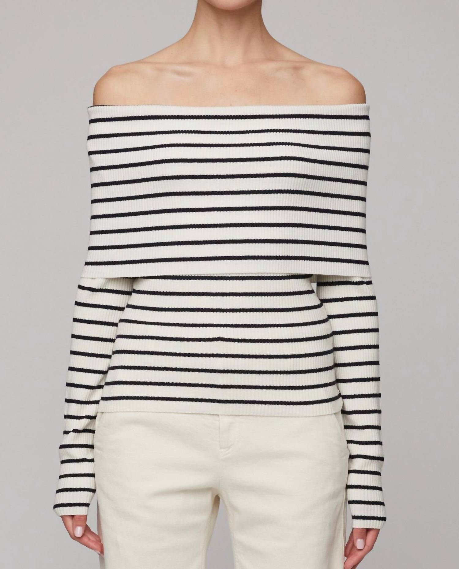 The perfect long sleeve tee that goes with just about anything. Embrace understated elegance with the A.L.C. Off The Shoulder Top in a chic white and midnight stripe, perfect for a fall vacation ensemble. Designed with long sleeves, this piece embodies the quiet luxury trend with its effortless pull-on style and sophisticated off the shoulder neckline. The striking stripe pattern adds a touch of modern flair. Origin information is not specified.