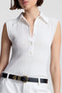 Meet the Ollie Sleeveless Top by A.L.C., a chic addition to your minimalist summer wardrobe. Crafted from a blend of 78% cotton and 22% nylon, this textured piece showcases a classic spread collar and a convenient button placket. Designed to flatter, it measures a stylish 22.375" in length. To maintain its pristine bright white hue, a dry clean is recommended.