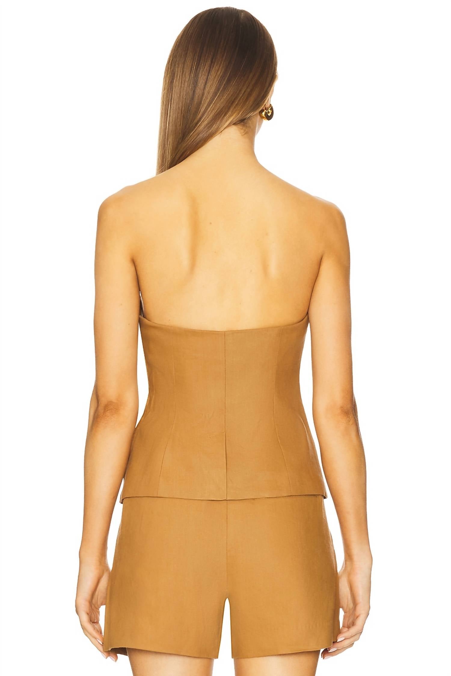 Fit, fabric and functionality. This tank top checks all the boxes. Elevate your style with the Renee Top by A.L.C., a chic copper piece that effortlessly captures attention. This solid linen blend top features a unique strapless design complete with a non-stick silicone edge for comfort. Composition: 52% Linen, 45% Viscose, 3% Elastane with a luxurious lining blend, ensuring a perfect fit. Closure: Side zipper closure with a fake button at the front. Care: Dry clean only. Garment Length: 16.5 inches.