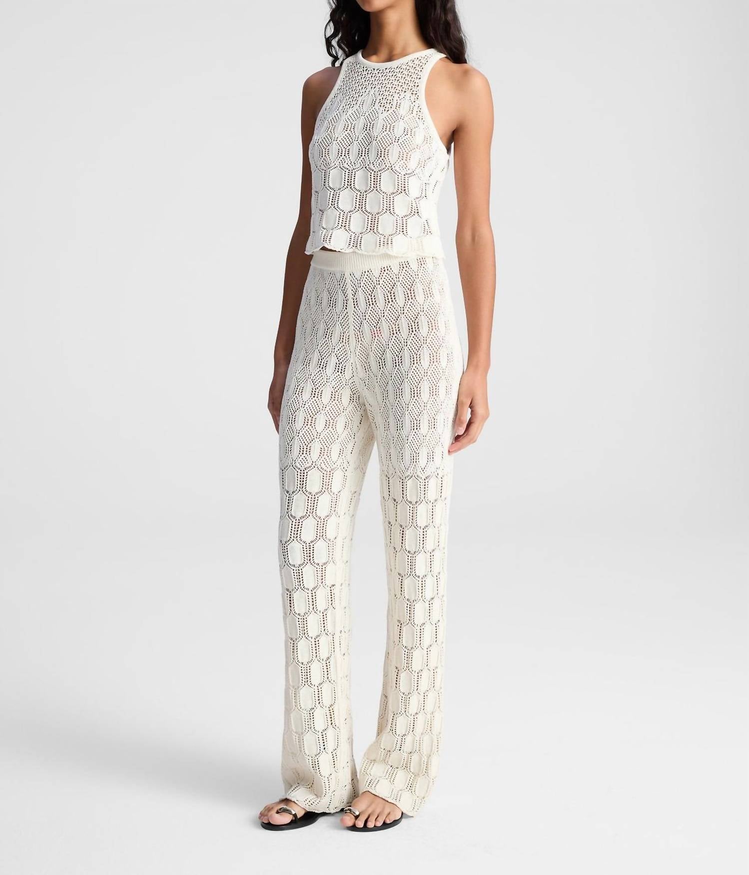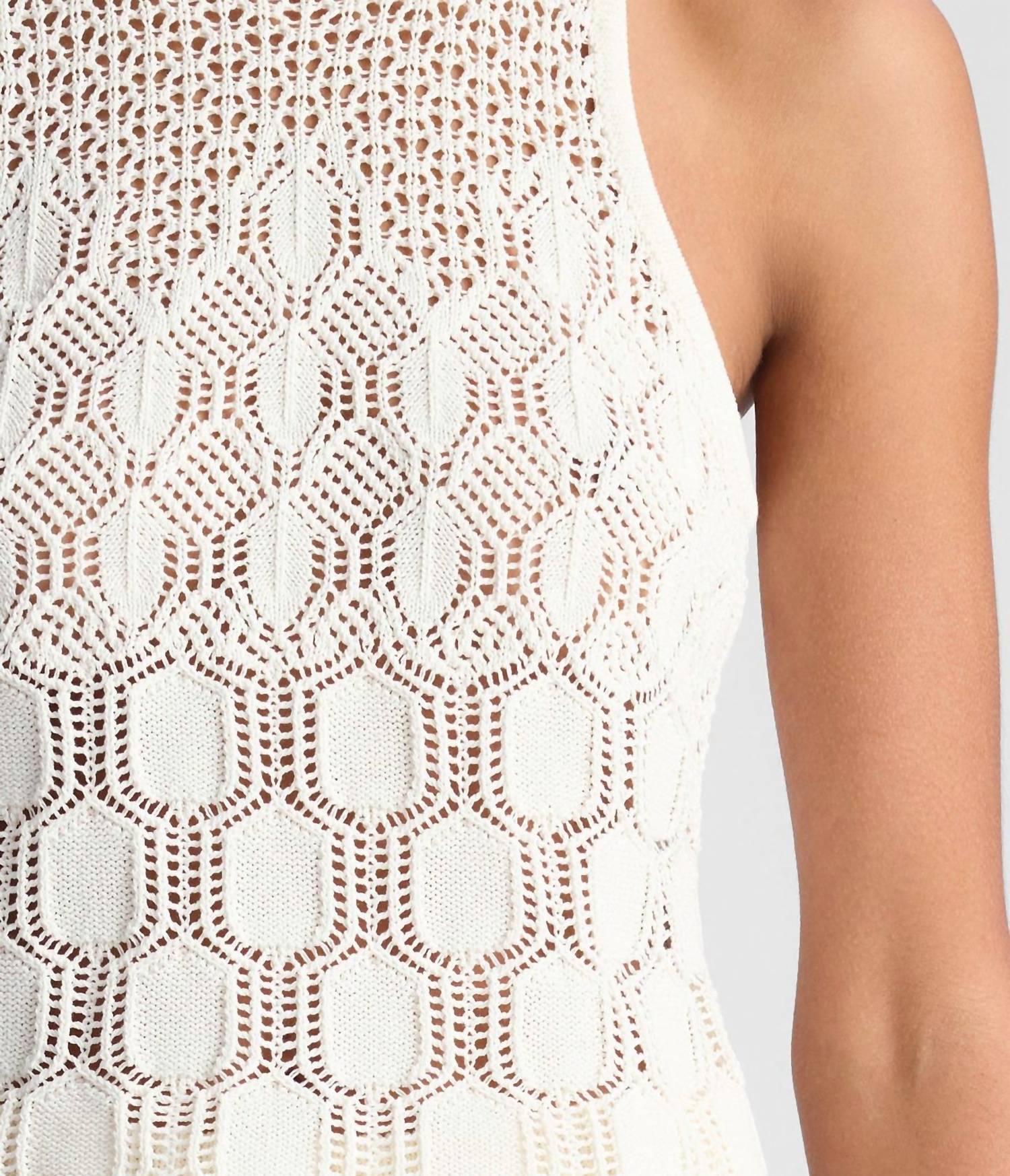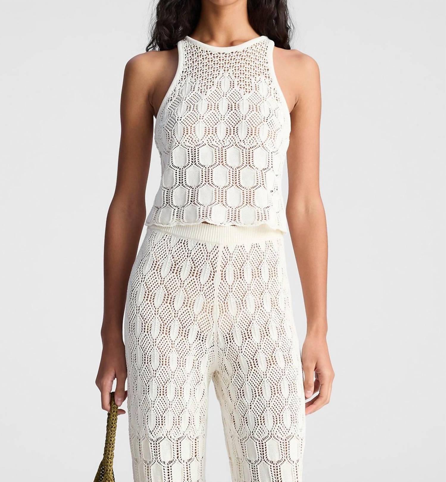 This classic tank top is perfect for layering and cute enough to wear on its own. The Rosa Top is made from a luxurious blend of soft cotton and silk yarn in off-white, showcasing an openwork pattern inspired by delicate heirloom crochet. This fitted halter design features a high neckline and subtle scallop edging, creating a refined, vintage-inspired aesthetic. Perfect for adding texture to your wardrobe, it pairs beautifully with everything from the coordinated Jonas pants to tailored shorts for a stylish, warm-weather look.