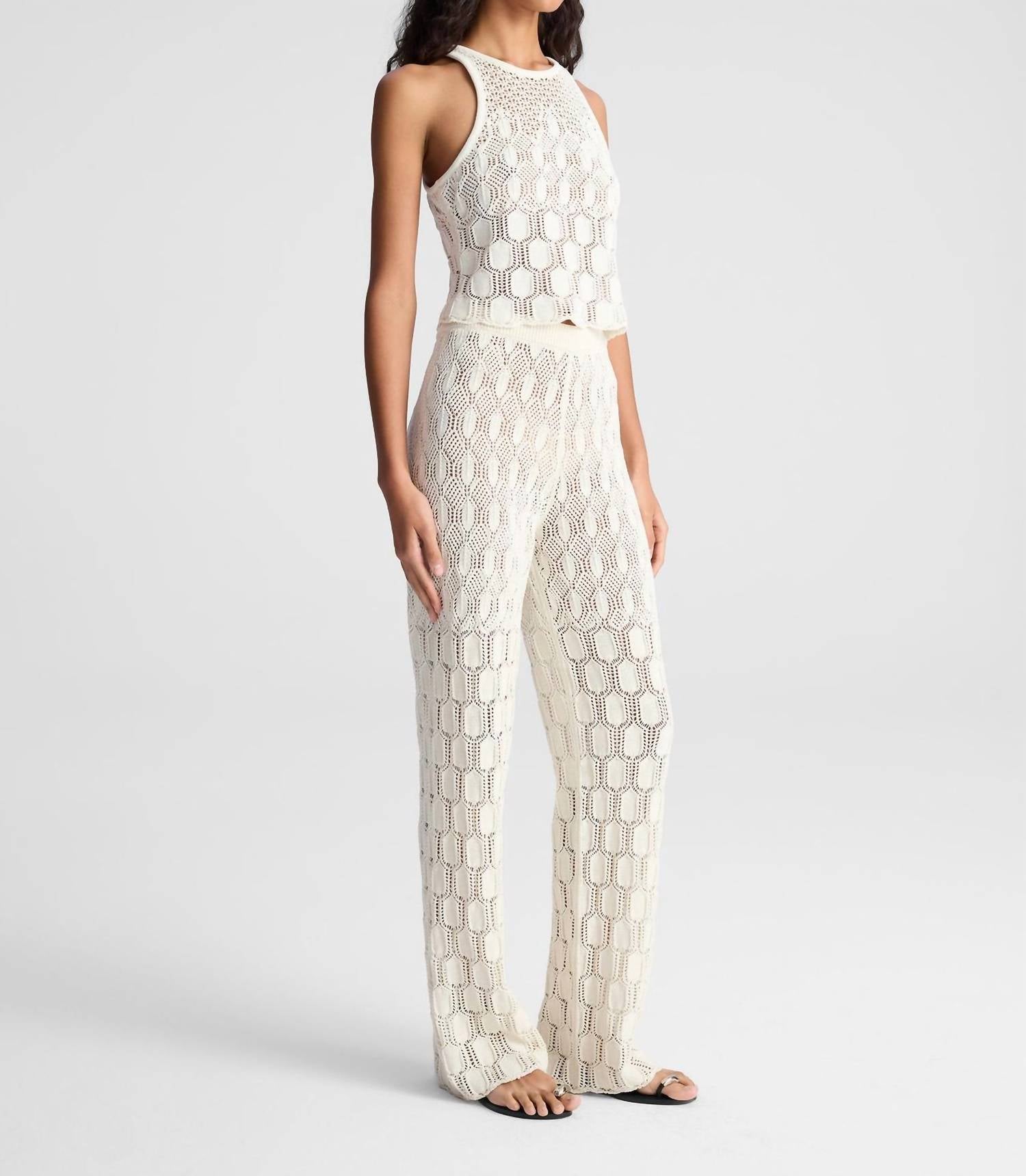 The Rosa Top is made from a luxurious blend of soft cotton and silk yarn in off-white, showcasing an openwork pattern inspired by delicate heirloom crochet. This fitted halter design features a high neckline and subtle scallop edging, creating a refined, vintage-inspired aesthetic. Perfect for adding texture to your wardrobe, it pairs beautifully with everything from the coordinated Jonas pants to tailored shorts for a stylish, warm-weather look.