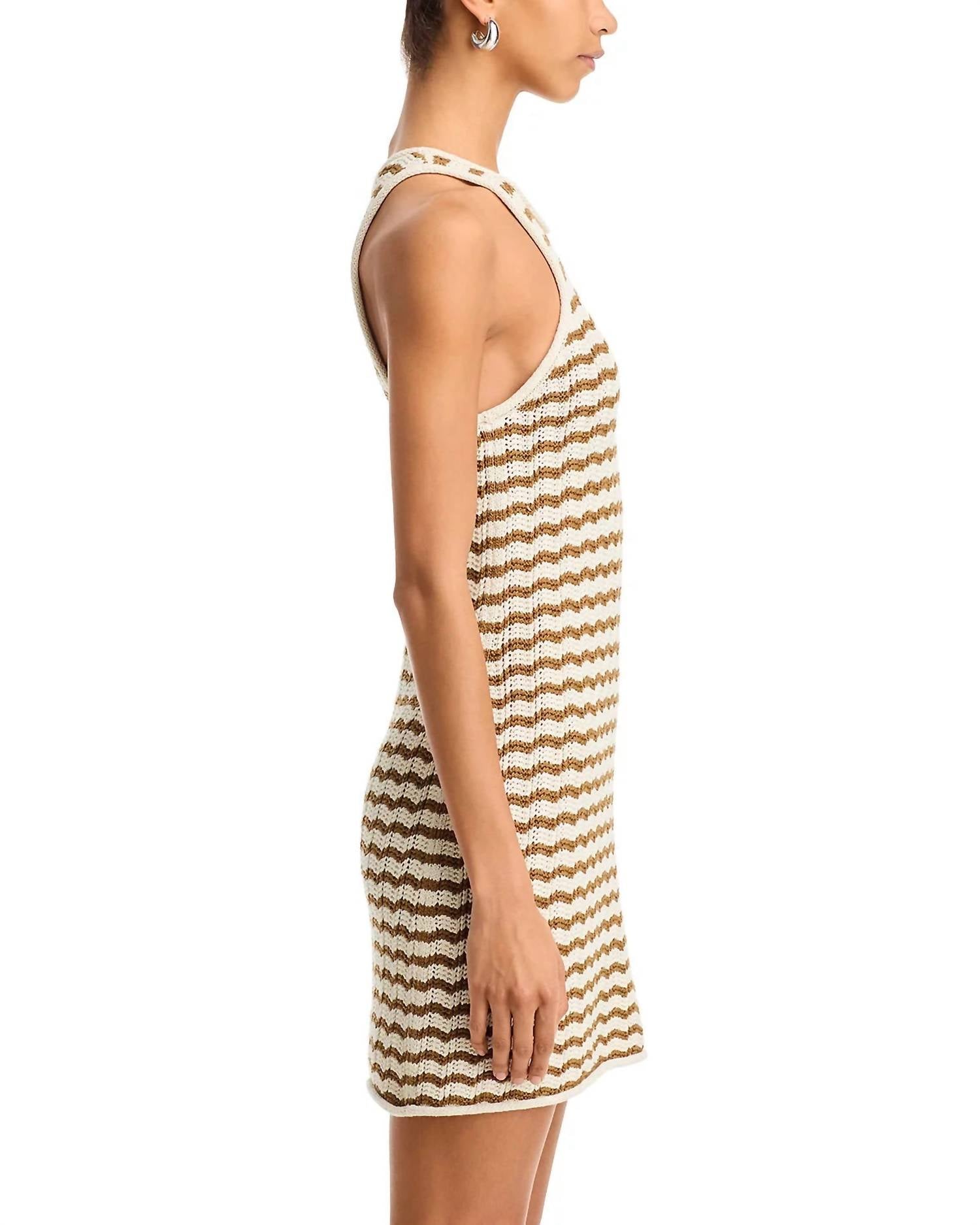 A short and breezy dress for those warmer days. Embrace sophisticated style with the A.L.C. Striped Sweater Dress in Parchment/Aged Bronze, perfect for homecoming and beyond. This sleeveless, bodycon mini dress combines a classic round neck and pullover style, showcasing a chic stripe pattern. Ideal for staying on-trend, it embodies the quiet luxury trend of the season. The dress is crafted for elegant yet understated occasions.