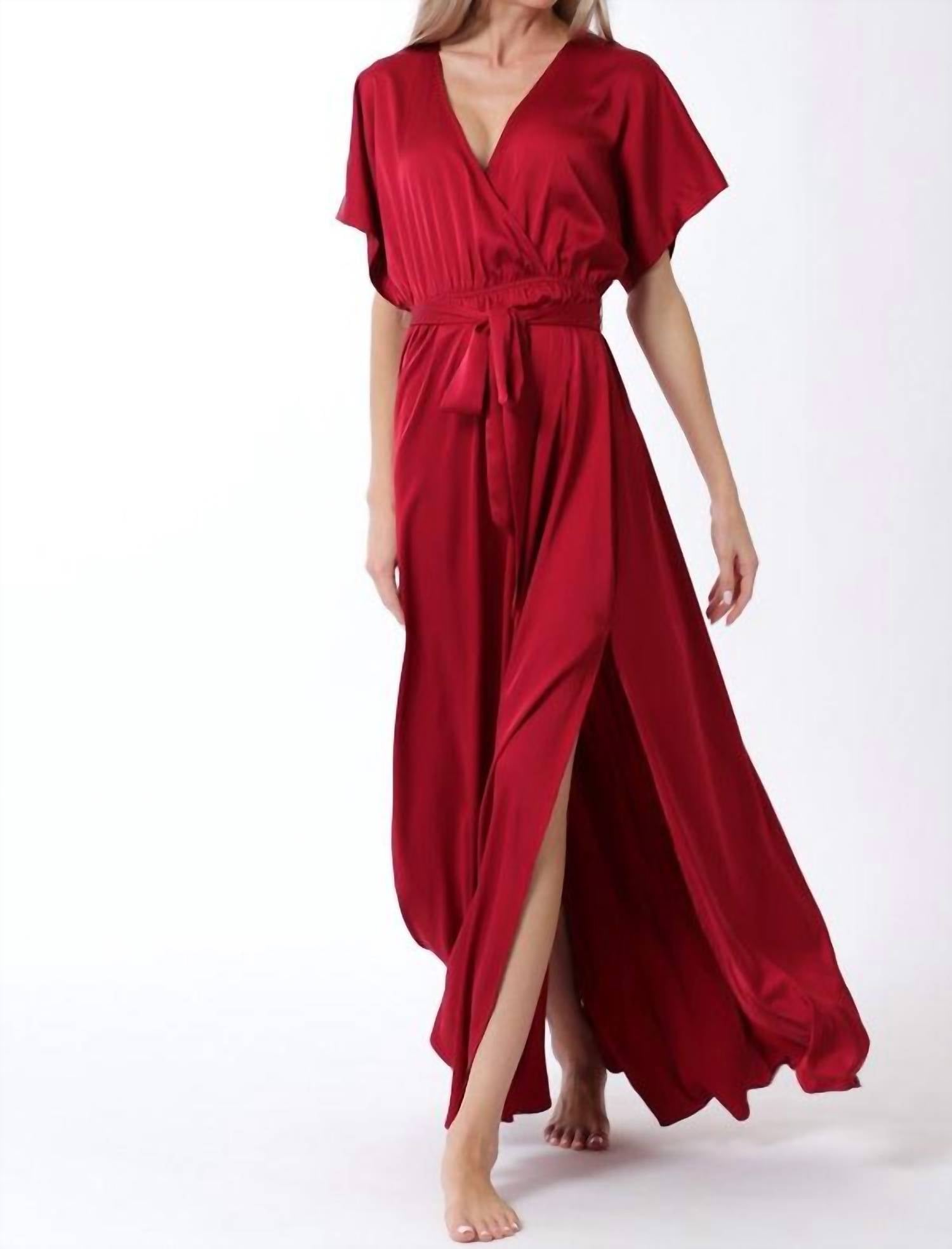 Elevate your holiday wardrobe with the Aakaa Maxi Dress With Dolman Sleeves in a rich burgundy hue. Featuring short dolman sleeves, this dress boasts a solid pattern and a flattering empire waist silhouette. Crafted from 97% Polyester and 3% Spandex, this full-length dress with a side slit offers both flow and comfort. Designed with a convenient tie closure, it is best cared for with dry cleaning to maintain its elegant allure.