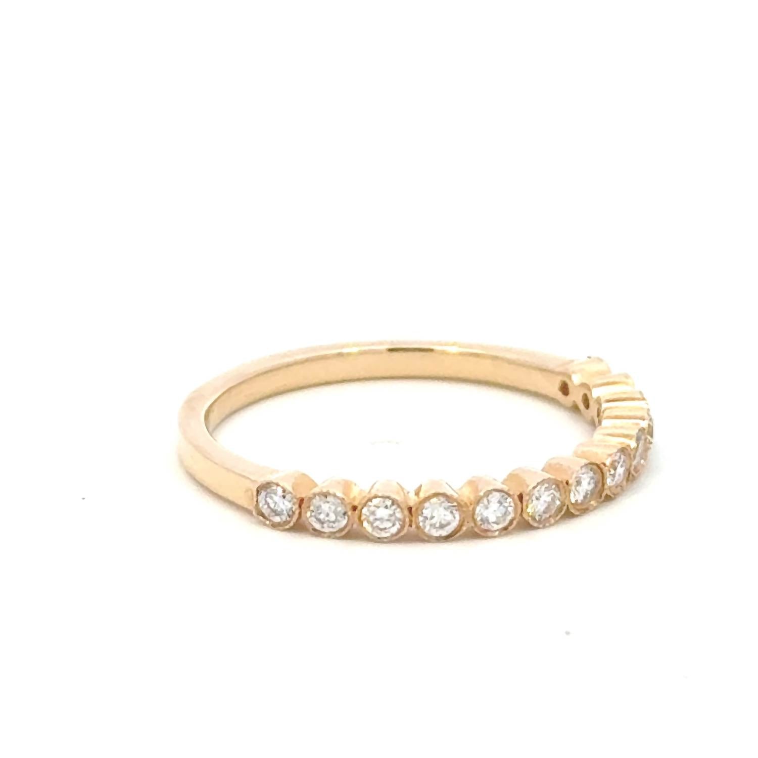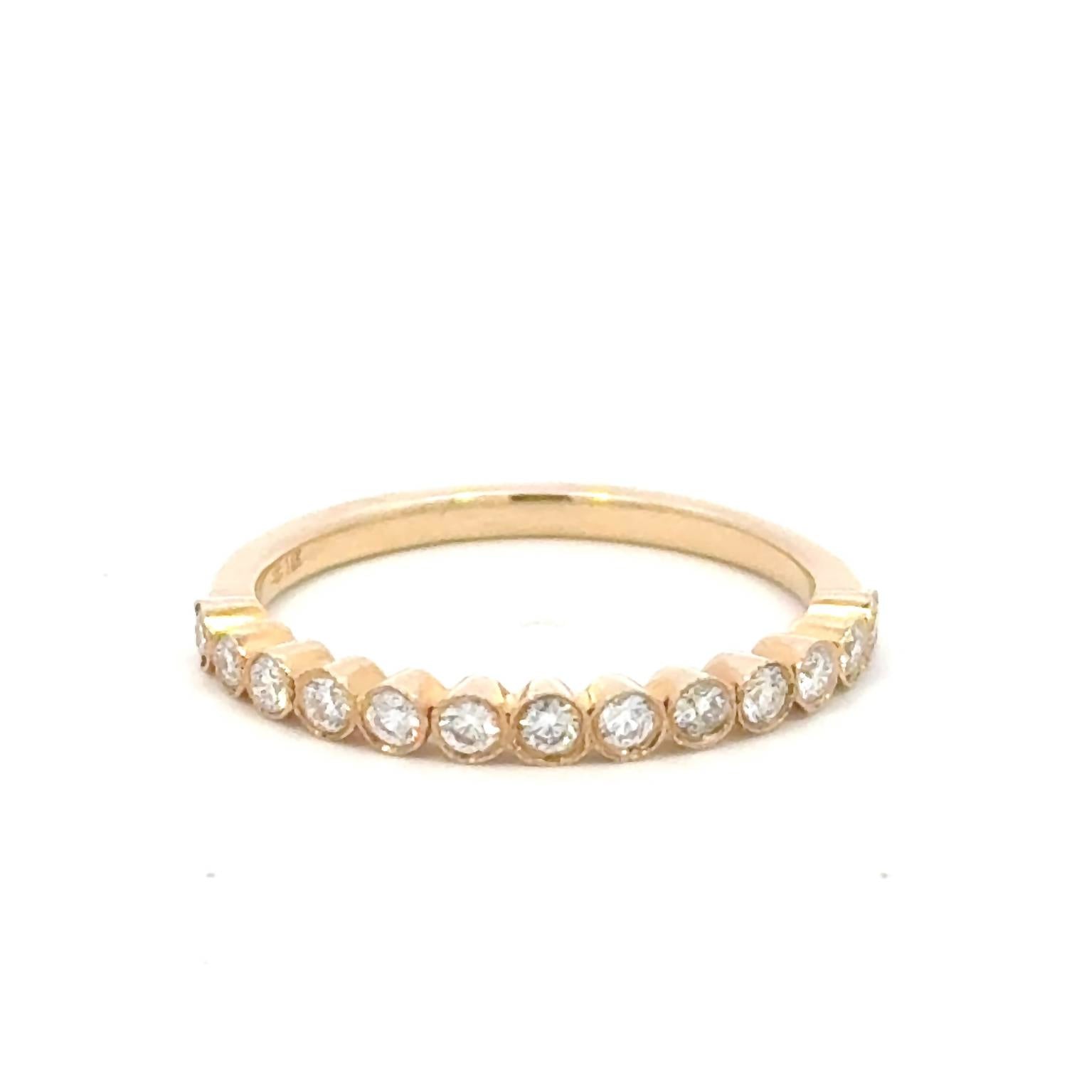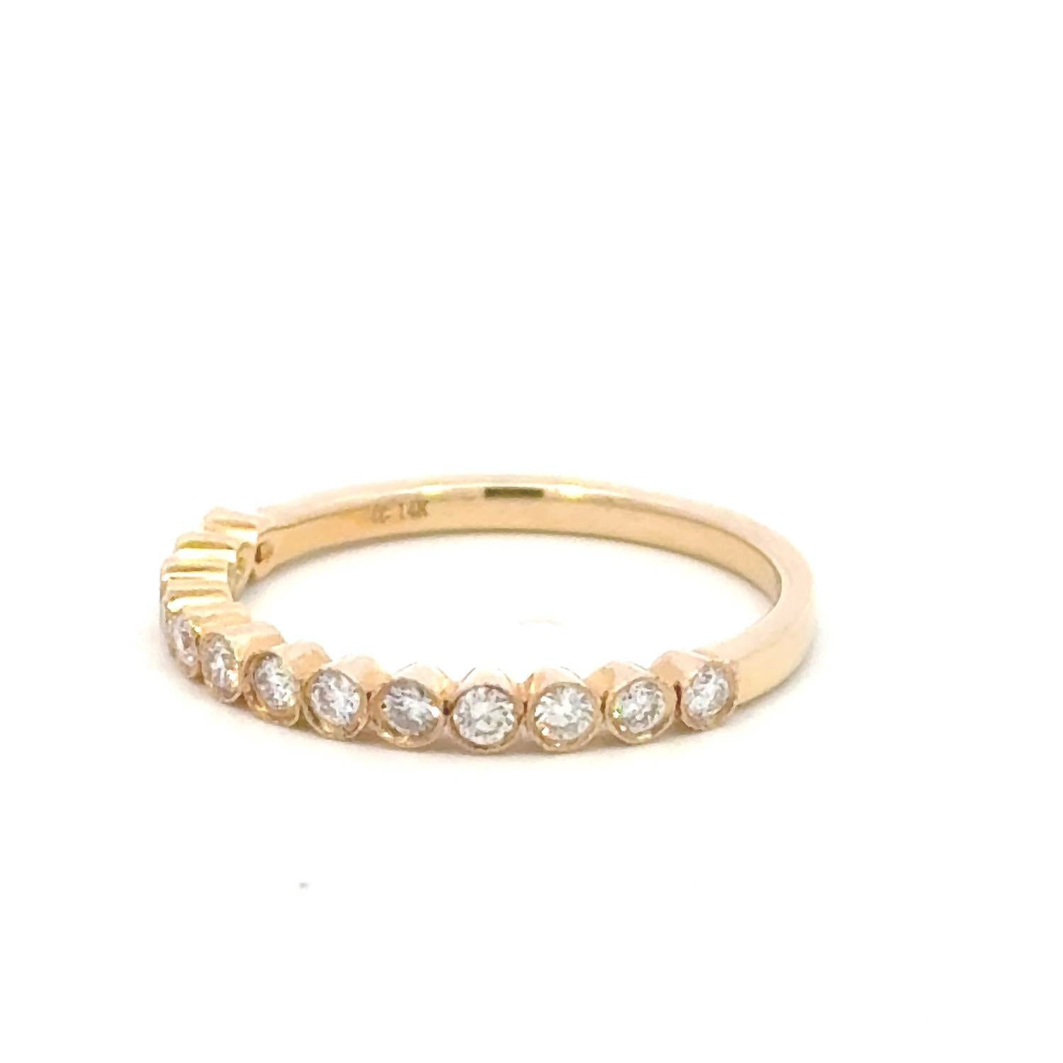 Wear this ring stacked or by itself... you can't go wrong. Sleek and timeless, this 14K yellow gold band features 0.30 carats of natural round brilliant and baguette diamonds. Bezel-set rounds are paired with crisp baguette accents in a channel-style design, offering clean lines and a subtle shimmer. With G-H color, the diamonds provide brilliant sparkle in a modern silhouette. Lightweight at 1.80 grams, this band is perfect for stacking or daily wear. Metal: 14K Yellow Gold. Diamond Weight: 0.30 Carat Total (Natural Diamonds). Diamond Shapes: Round Brilliant and Baguette. Setting Types: Bezel and Channel Set. Style: Stackable / Modern Diamond Band. Band Width: Approx. 1.6–2.0mm. Total Weight: 1.80 grams