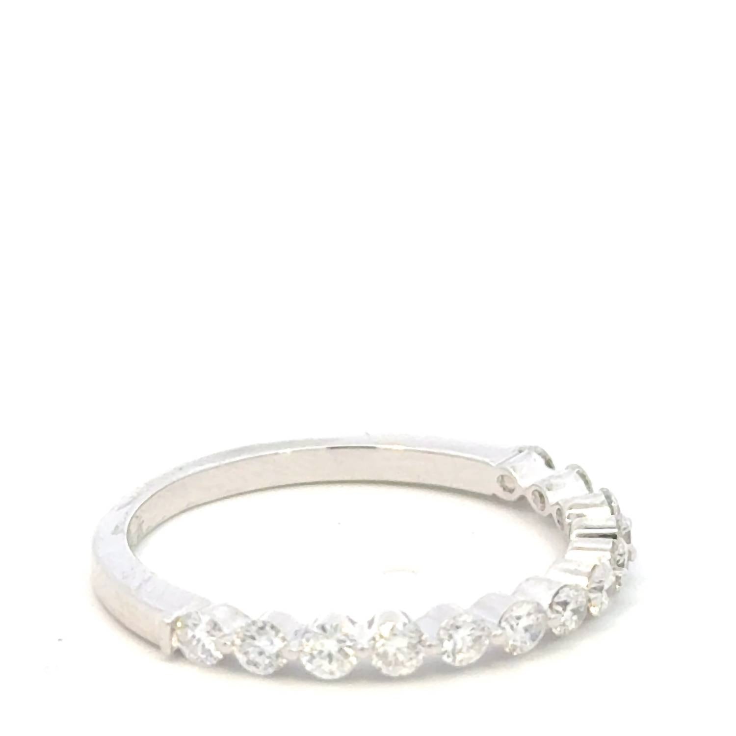 A striking balance of sparkle and structure, this band features 0.51 carats of natural round brilliant and baguette diamonds. Crafted in 14K white gold and weighing 1.70 grams, the combination of bar and prong settings offers a contemporary look with timeless appeal. Wear it stacked or solo for a refined touch of luxury. Details: Metal: 14K White Gold. Diamond Weight: 0.51 Carat (Natural Diamonds). Total Weight: 1.70 grams. Diamond Shape: Round Brilliant & Baguette. Setting Type: Bar & Prong Set. Band Width: Approx. 2mm. Style: Modern Diamond Band Ring