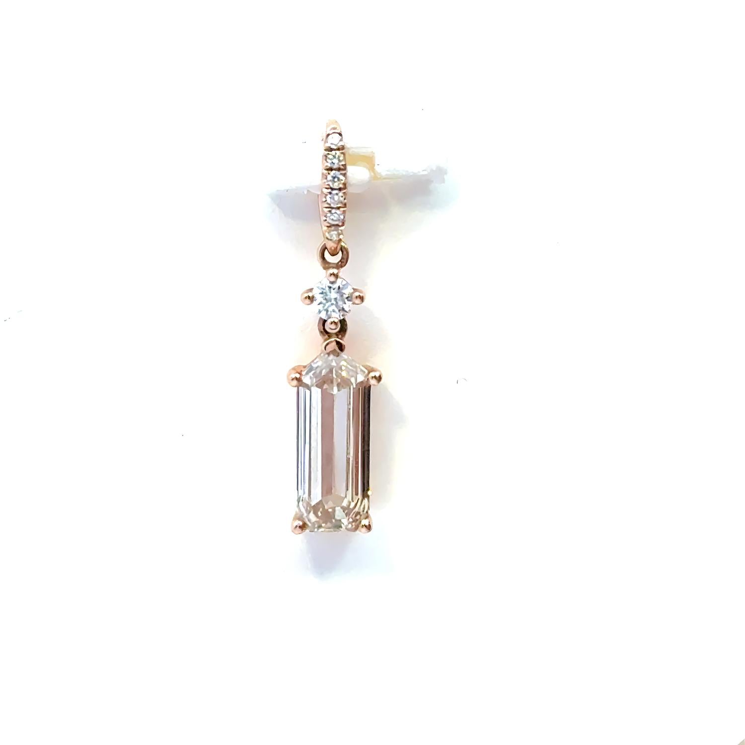 The perfect stand-out necklace that complements even the most basic t-shirt. Stunning drop pendant featuring a 0.90 carat natural emerald-cut diamond with round brilliant accent. Crafted in 14k rose gold (0.51 grams) with classic prong settings that maximize brilliance. The warm rose gold beautifully contrasts the sparkling diamonds, creating a timeless piece perfect for everyday elegance or special occasions. 0.90 total carat weight natural diamonds. Emerald cut main stone with round brilliant accent. 14k rose gold construction (0.51 grams). Classic prong setting. Drop/dangle pendant design. Perfect for layering or wearing alone.