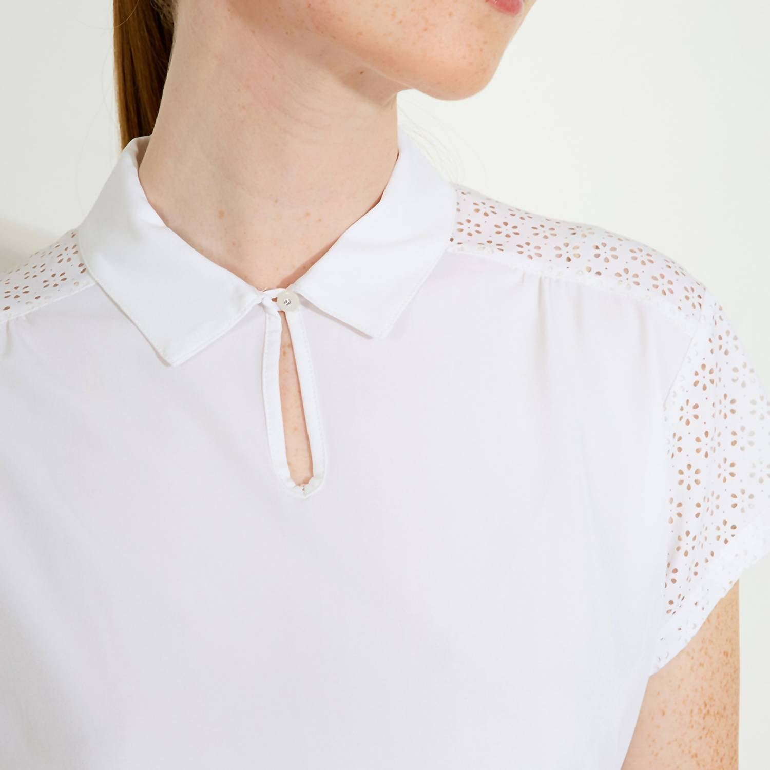 Introducing the Manga Cupsleeve Polo by Abacus Sportswear US, a chic short sleeve top in classic white perfect for spring and summer days on or off the golf course. Made from breathable polyester with a 4-way stretch, this piece ensures comfort with its Drycool and wicking properties. Featuring a decorative punched flowery pattern on the sleeves and yoke, it adds a playful touch, completed with a cut and sewn collar and a rhinestone button. Closure: Pull on. Care: Machine wash, tumble dry.