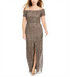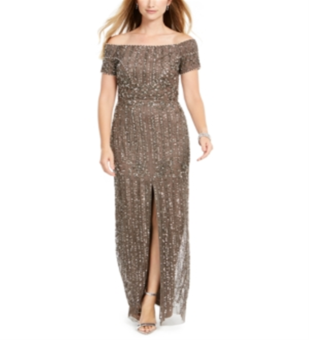 Adrianna Papell's off-the-shoulder| of-the-moment gown shimmers with elegance and a thigh-grazing slit.| Approx. 56-1/2 long from center back to hem. Length is based on size 4 and varies 1/4 between sizes| Hidden back zipper with hook-and-eye closure| Long length| Straight neckline