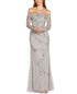 Show off the curve of your shoulders in an unforgettable way with Adrianna Papell's beaded evening gown.| Approx. 62 long from high point shoulder to hem. Length varies 1/4 between sizes | Floor-length formal dress| Off-the-shoulder neckline; gown silhouette| Concealed back zipper closure| Long semi-sheer sleeves| Beaded pattern throughout
