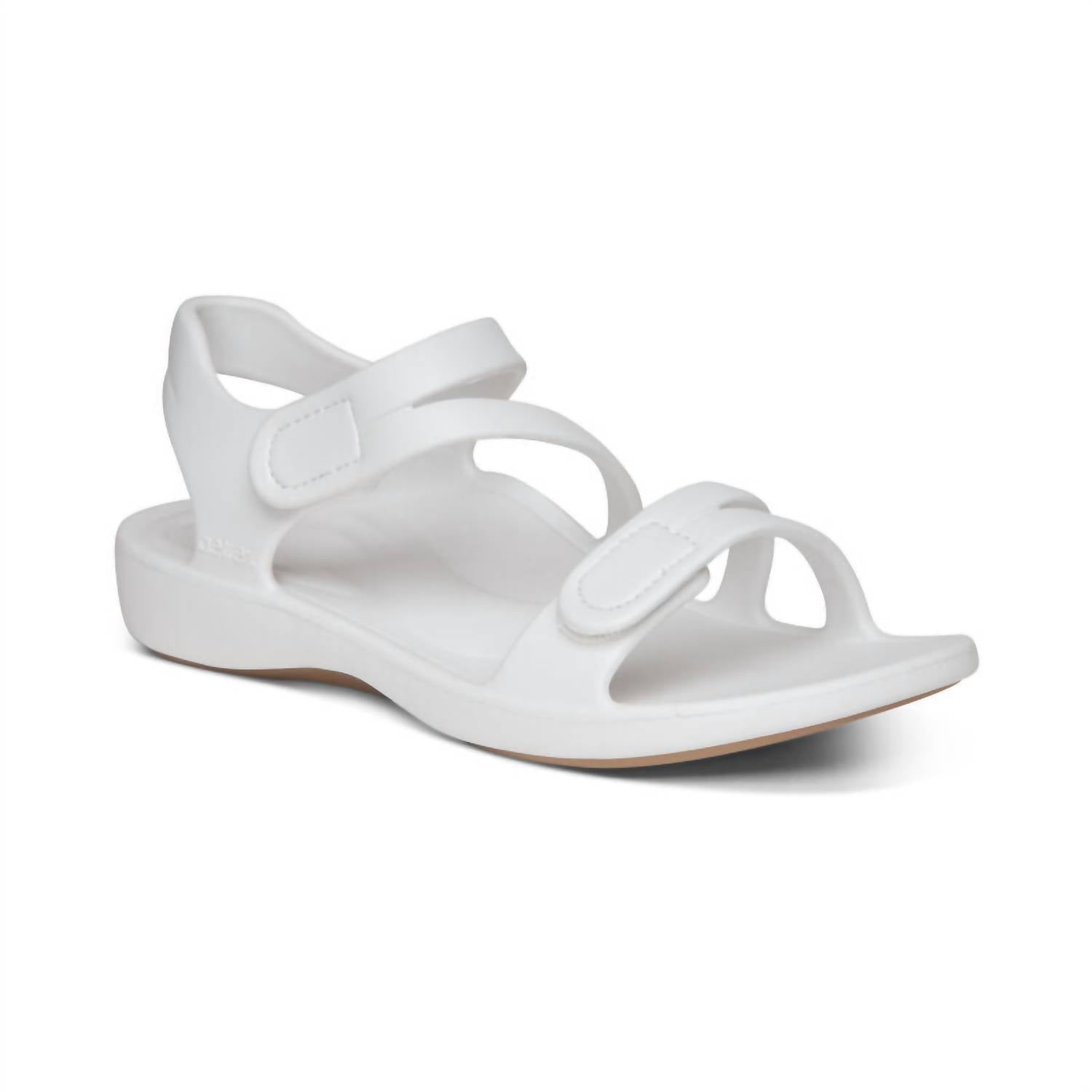 The UltraSky™ light-weight EVA foam will have you feeling like you are walking on clouds, all summer long. The Aetrex Cobra Orthotic System is Built-In to every pair: Arch support helps to stabilize and align feet. Arch support helps to relieve common foot pain & plantar fasciitis. Support pod to help relieve forefoot pressure. UltraSky ™ EVA Foam to cushion and provide superior comfort. Contoured rearfoot to craddle your heel and relieve pressure. Details: Adjustability: Hook and Loop Closures to accommodate many widths. Material: Light-weight UltraSky ™ EVA Foam for comfort and durability. Extreme cushioning and shock absorption to help prevent injury and provide unmatched support. Water-friendly construction, so light they float. Removable Insole: None. Heel Height: 1.125"