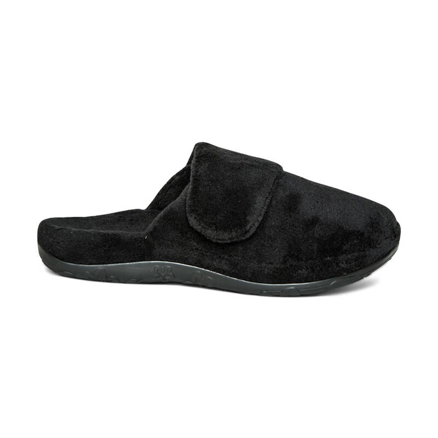 Closed toe house shoe. Hook and loop closure. Soft, plush fabric upper. Soft, plush fabric footbed lining. Lightweight rubber outsole. 1.125" Heel height. True to size. Hand wash.