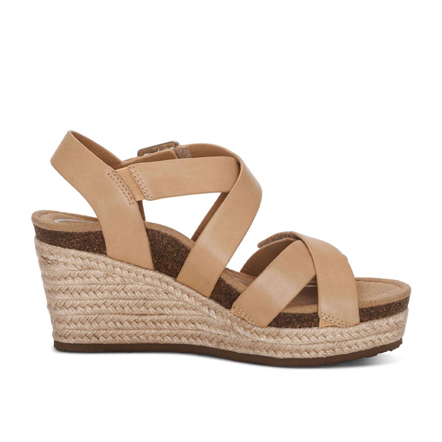 Dresses, denim, shorts... these wedges go with just about anything. Expertly crafted to combine style with superior support, these sandals feature genuine leather in an elegant sand color, with a 3-inch wedge heel for added height and flair. The open-toe design includes criss-cross band detailing and adjustable hook and loop closures to ensure the perfect fit. With integrated arch support and a memory foam footbed, each shoe is anatomically designed to provide premium comfort, bringing an ideal blend of fashion-forward design and functionality.