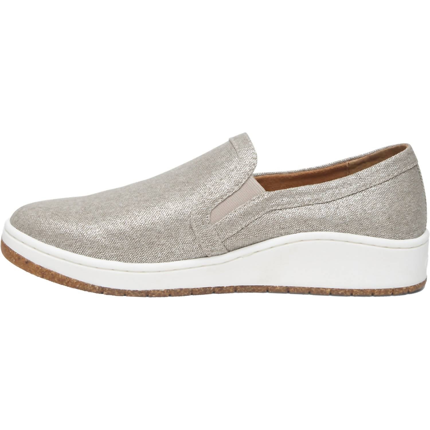Cute, functional, and comfortable. These sneakers check all the boxes. This casual slip-on sneaker features a canvas upper with dual elastic side panels for easy on and off. Built-in orthotic support provides arch stability, improves alignment, and helps relieve common foot pain. The UltraSky™ cushioned insole offers pressure relief and all-day comfort, while the removable insole allows for customization. A durable cork and rubber blend outsole adds traction and flexibility for everyday wear.