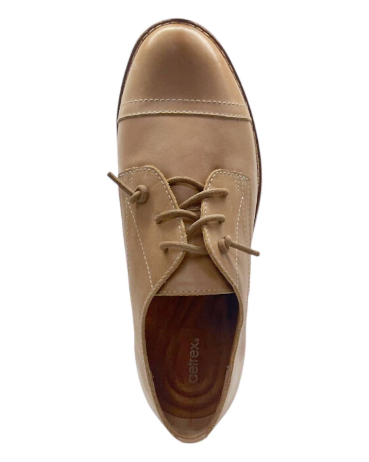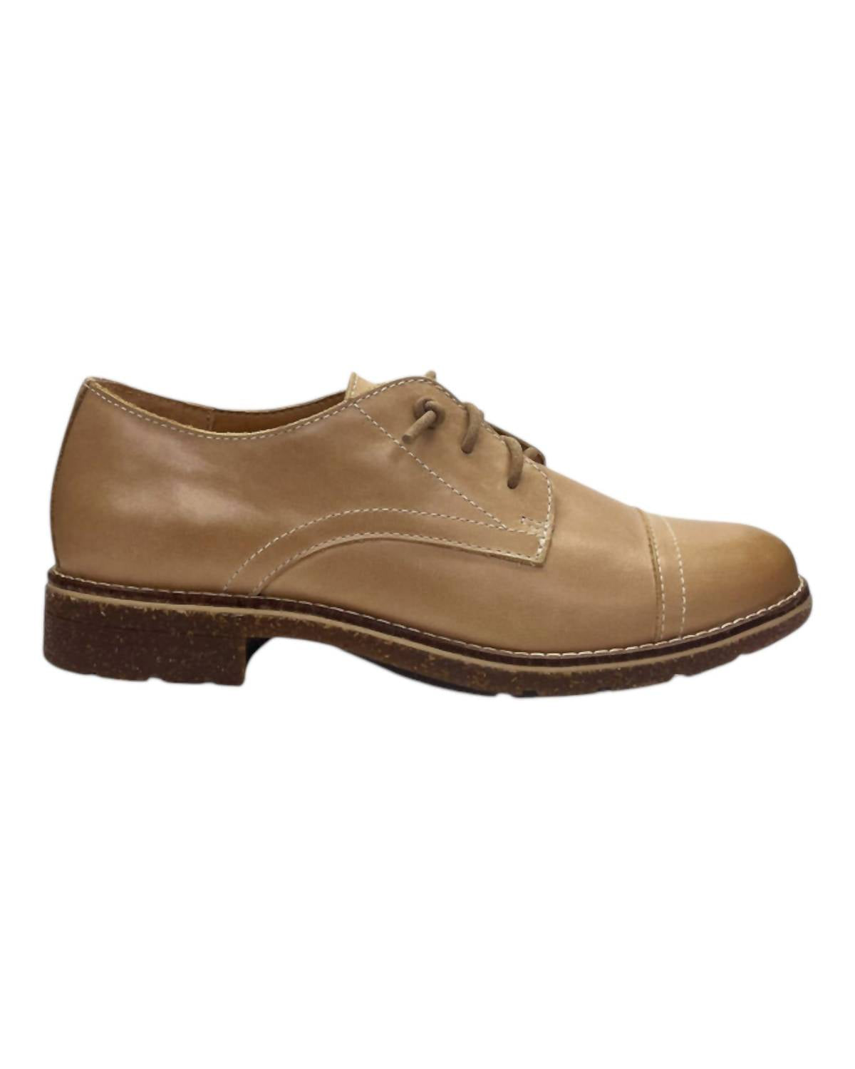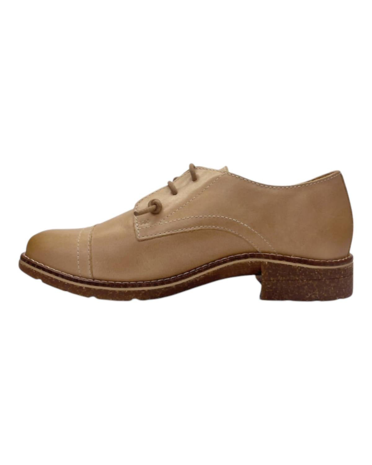 A women's slip-on Oxford shoe featuring a hidden gore for easy wear, 100% leather with a lightweight cork and rubber outsole. Clean it with a damp cloth and air dry it to maintain its quality.