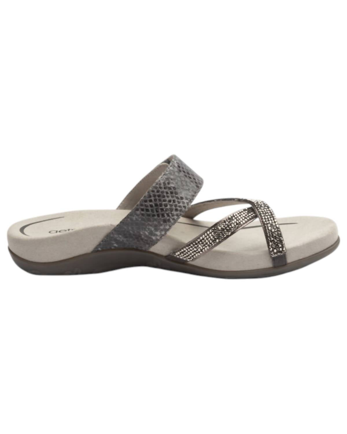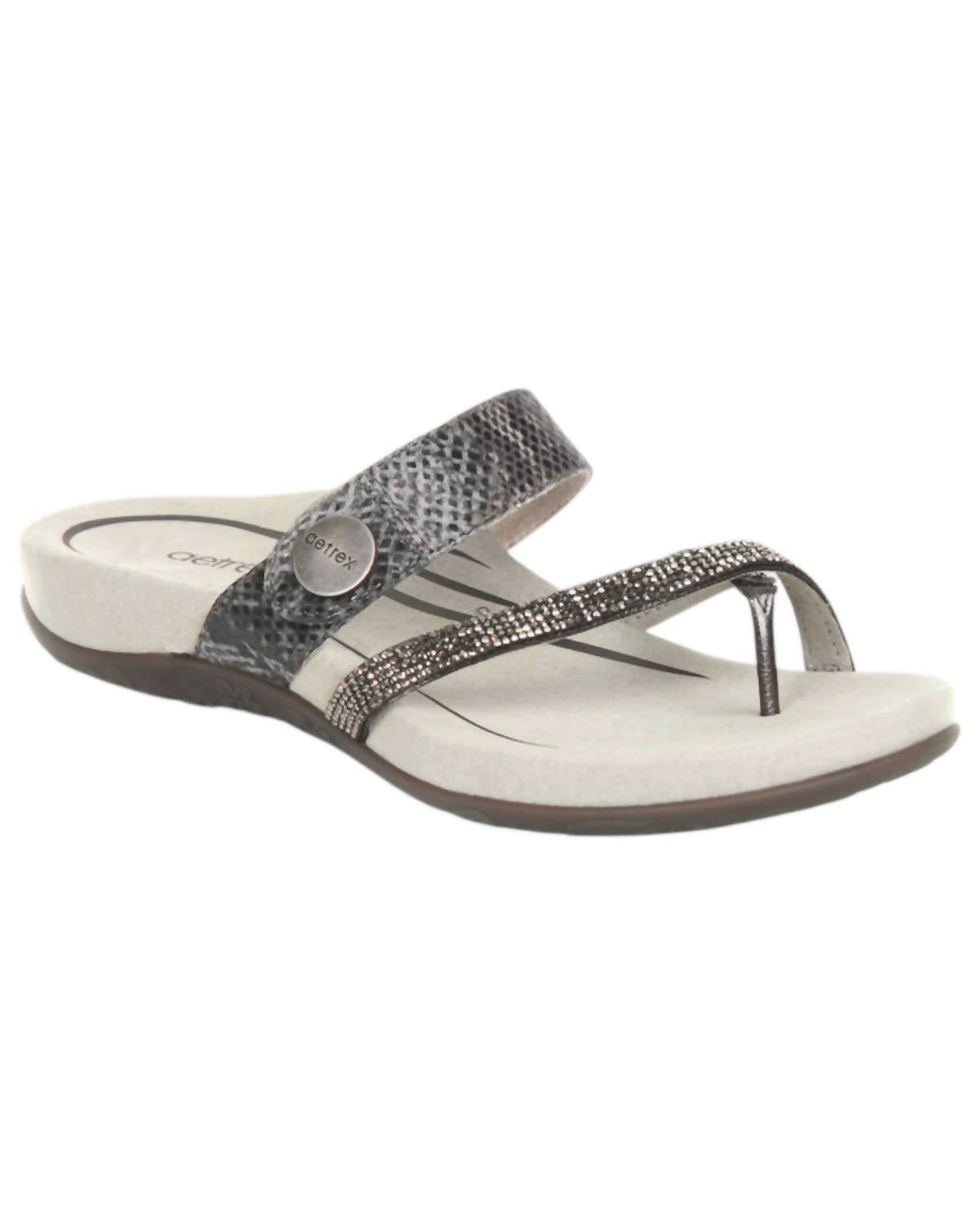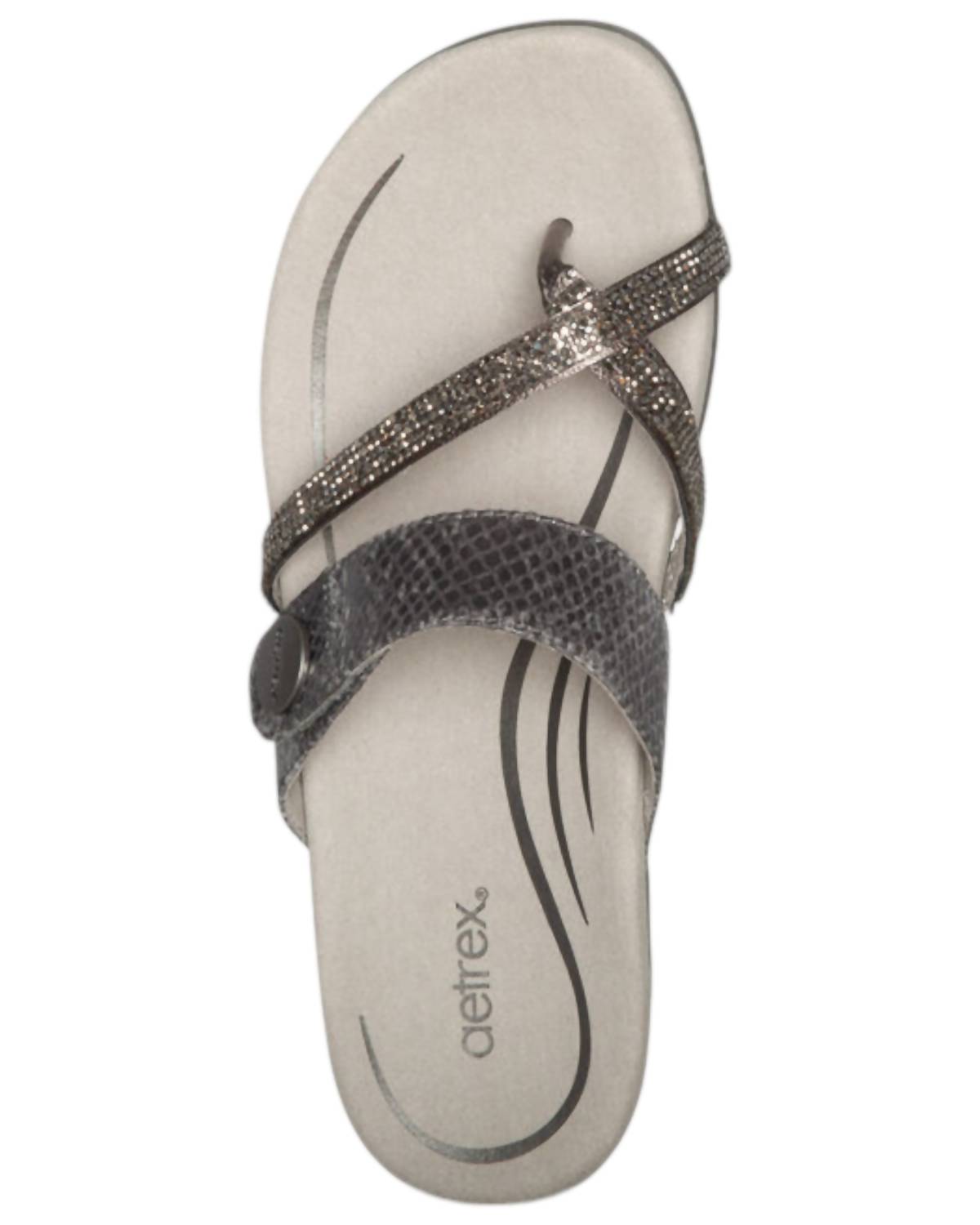 Classicly cute and all-day-wearable. We love this sandal. Elevate your style with the Women's Izzy Sandals by Aetrex, featuring a chic Pewter Sparkle finish. These women's slide sandals are crafted with a faux leather upper, and a soft microfiber footbed lining treated with antimicrobial technology. Designed with memory foam midsole and a rubber outsole, they offer both style and comfort. The adjustable hook-and-loop closure ensures a personalized fit, while the open toe and flat heel provide a casual, relaxed look. Care for them by gently wiping with a damp cloth and air drying for lasting wear.