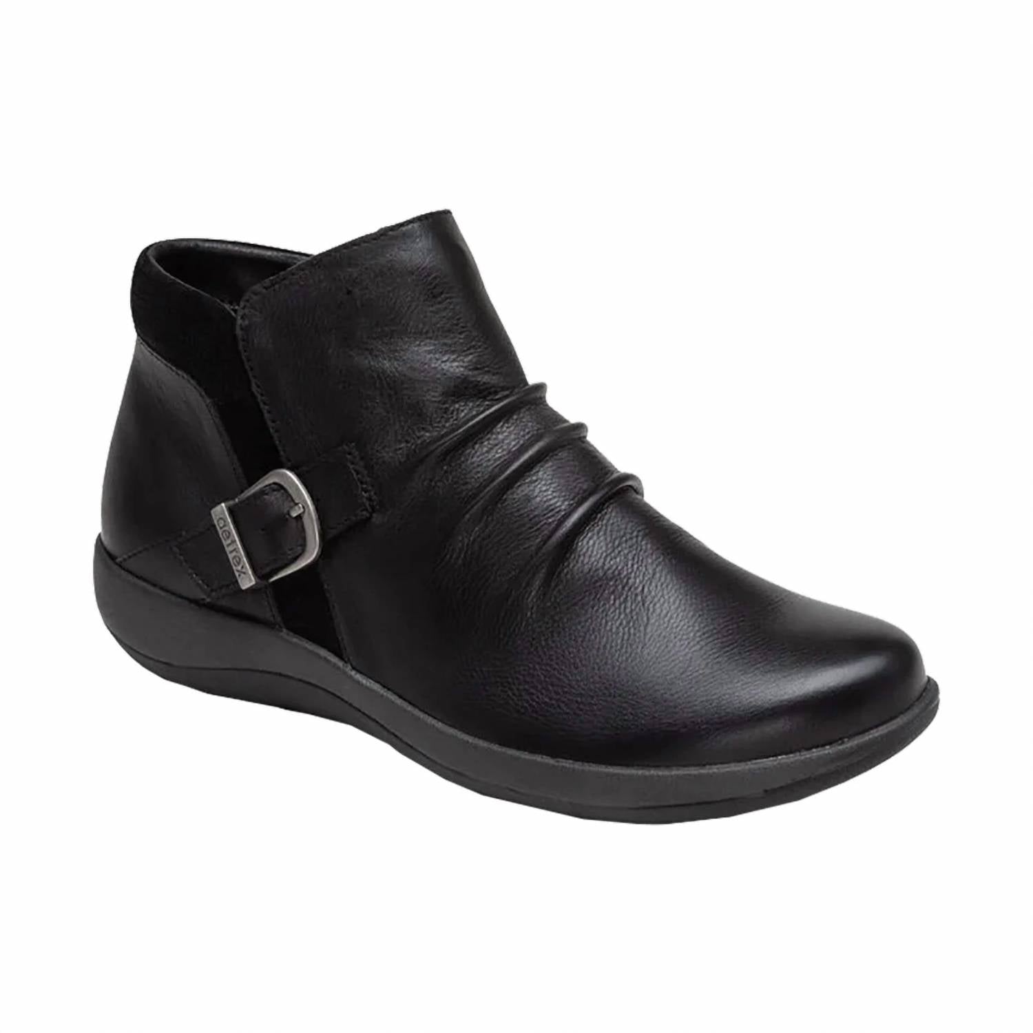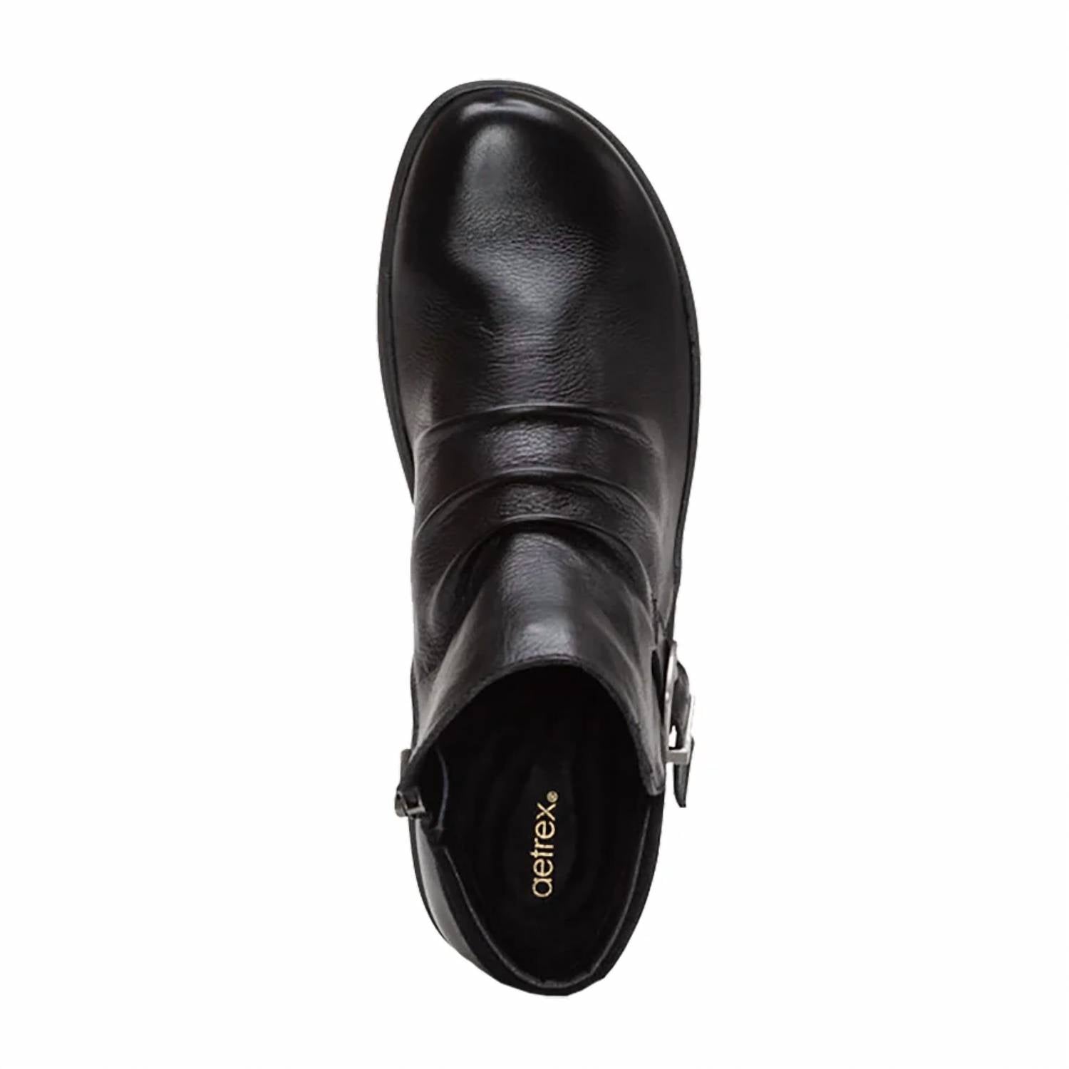 Say hello to the perfect, most versatile boot. The ankle height makes this style easily transition from day to night. Wear them with your favorite skinny jeans and tee for a more laid back look, or pair them with your favorite mini dress and jacket for a night out on the town. These leather boots with a pleated design come with a side zipper and adjustable buckle to keep your feet supported. Features Aetrex Orthotic System, built-in to ever pair. Arch support to help stabilize and align feet as well as relieve common foot pain and plantar fasciitis. UltraSky™ cushioning. Great for those with arch pain, wide feet, high instep, hammer toes or heel pain.